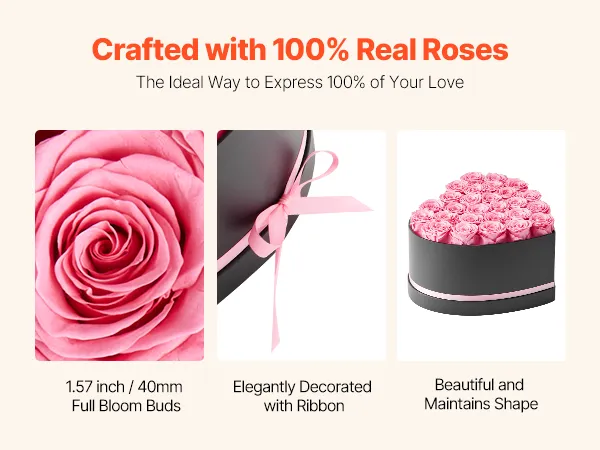 Featuring 1.57 inch / 40 mm natural rose buds, each bloom keeps delicate layers and texture With box and ribbon accents, this forever flowers bouquet remains elegant and steady for lasting beauty.