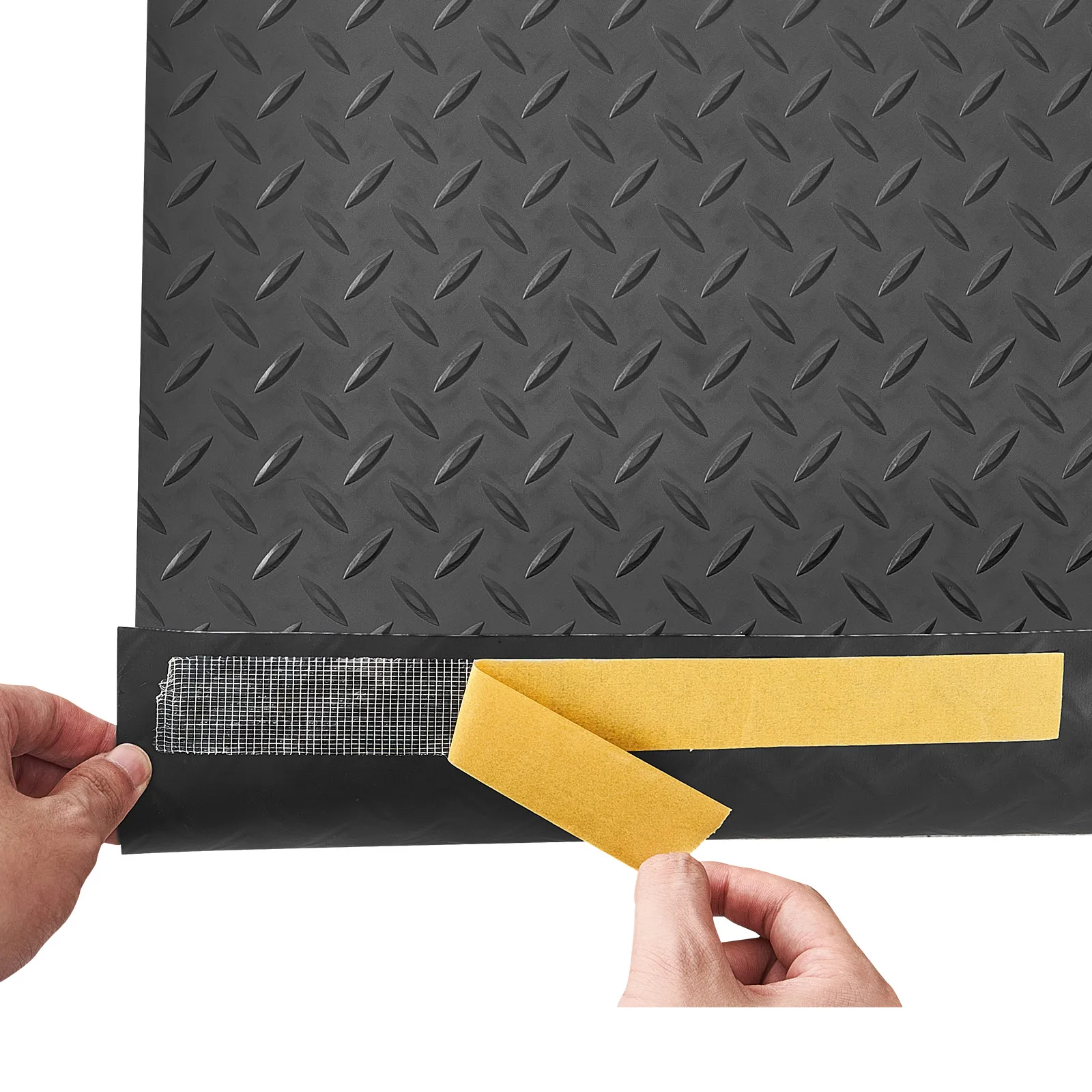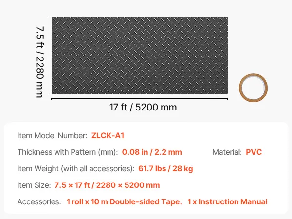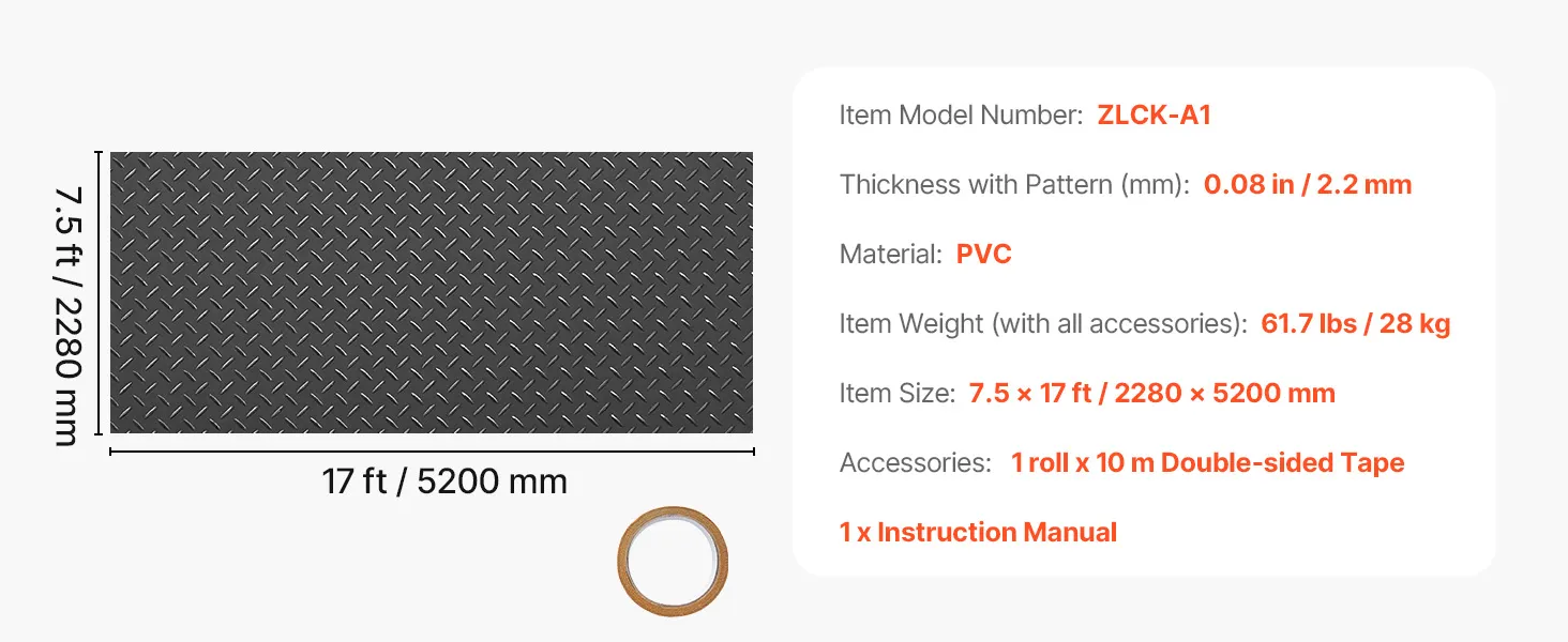 VEVOR Garage Floor Roll, 2.28 x 5.2 m Garage Flooring Mat, 2.2 mm Thickened PVC Diamond Plate Floor Protector Mat with Double-sided Tape, Non-Slip, Easy to Clean for Warehouse, Gyms, Trailer, Black