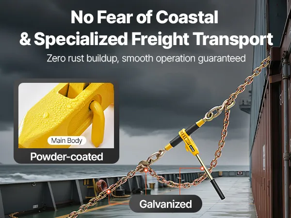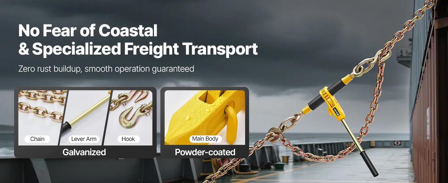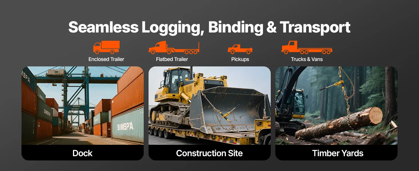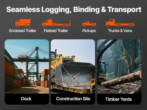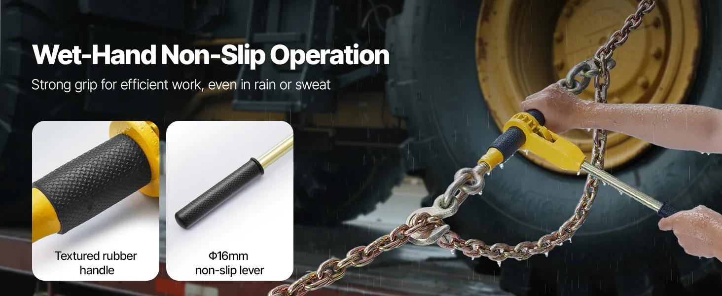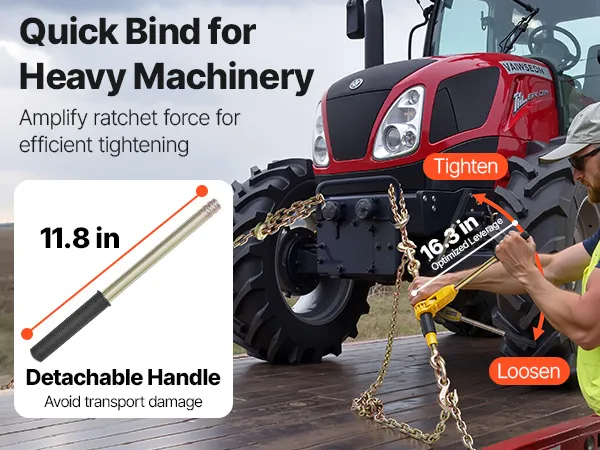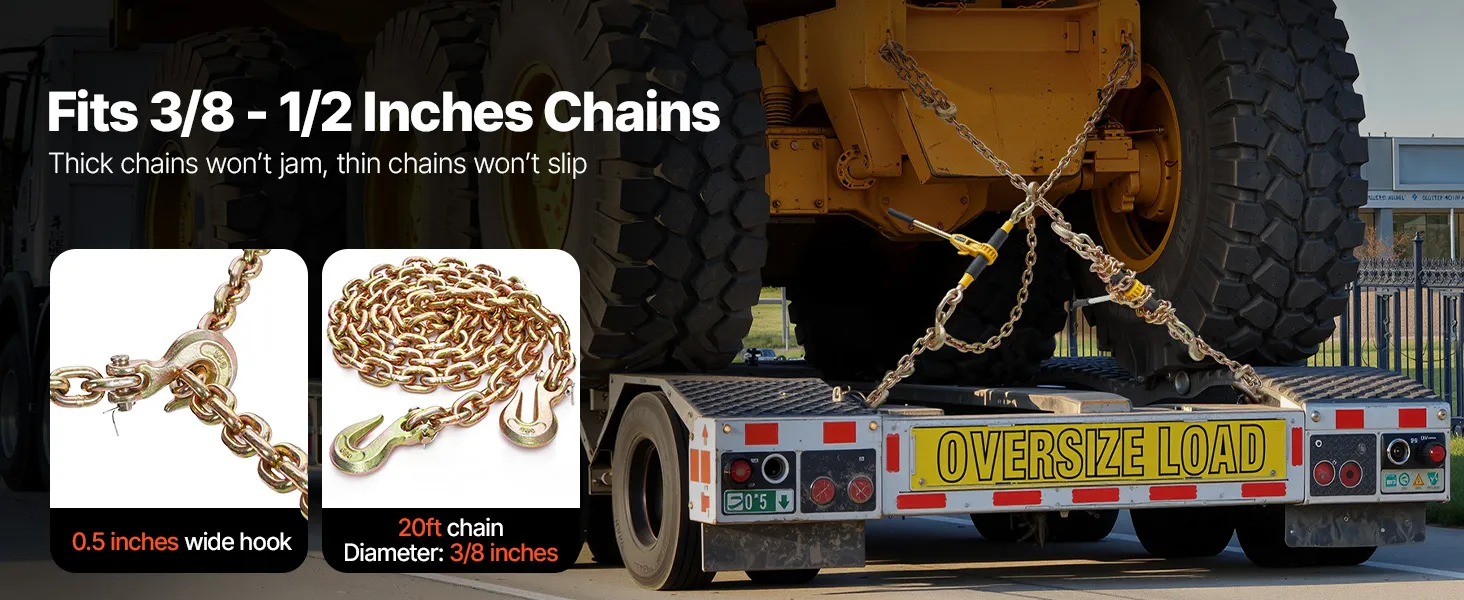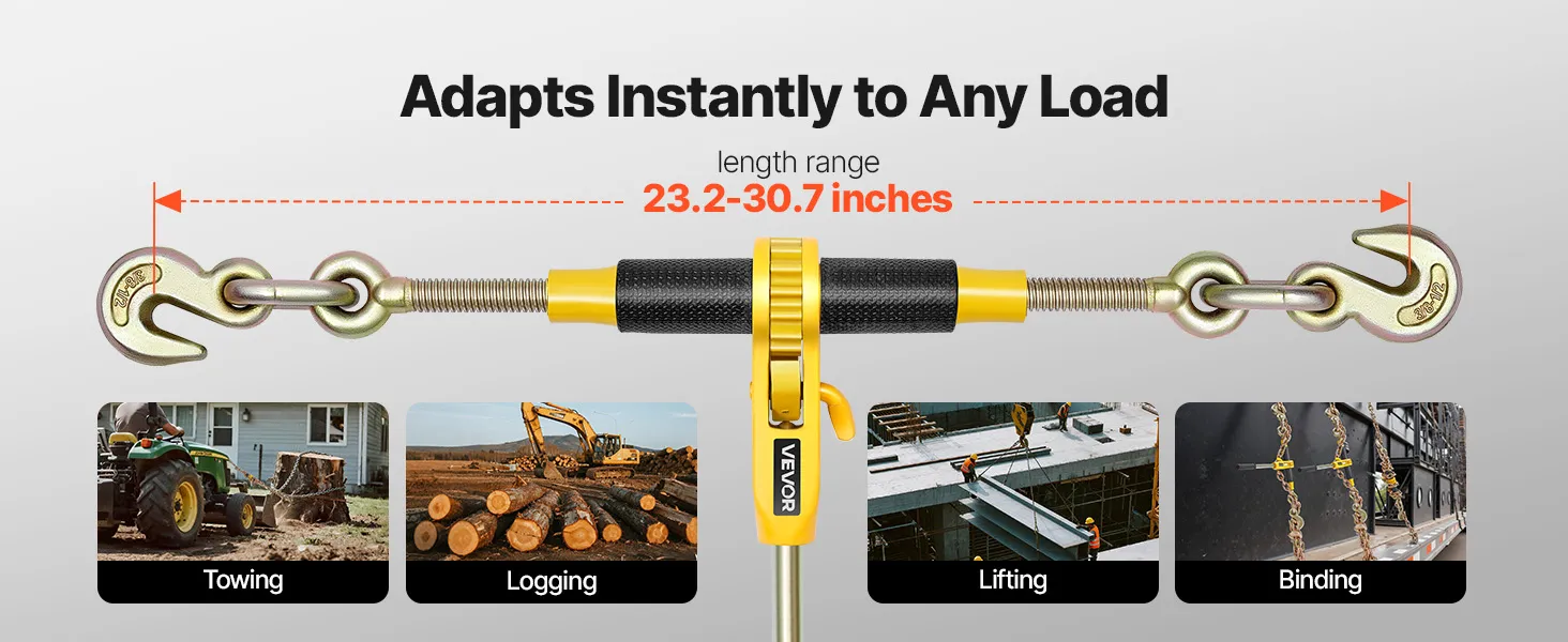 A: Adjusts from 23.2-inch (min) to 30.7-inch (max). Fits 3/8 to 1/2 inches chains—ideal for logging, binding, and transport.