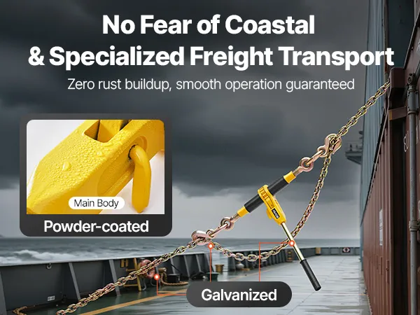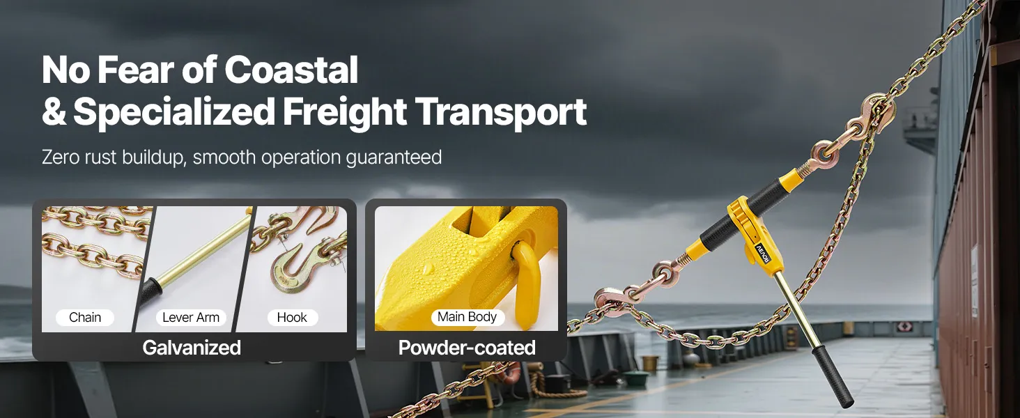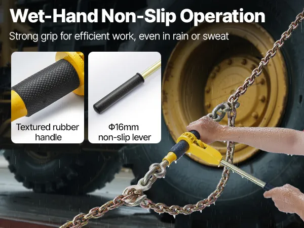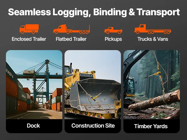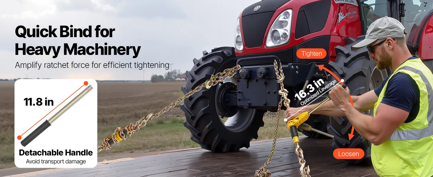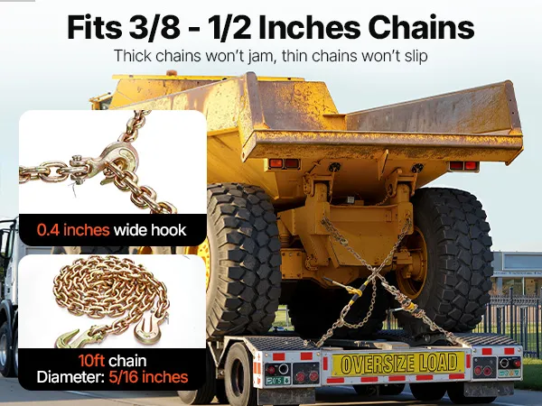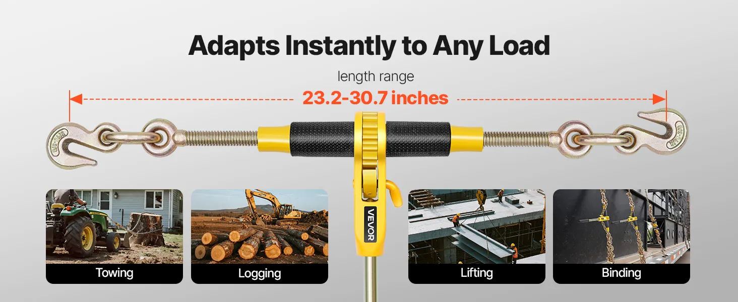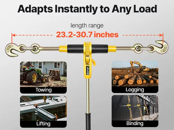 A: Adjusts from 23.2-inch (min) to 30.7-inch (max). Fits 5/16 to 3/8 inches chains—ideal for logging, binding, and transport.