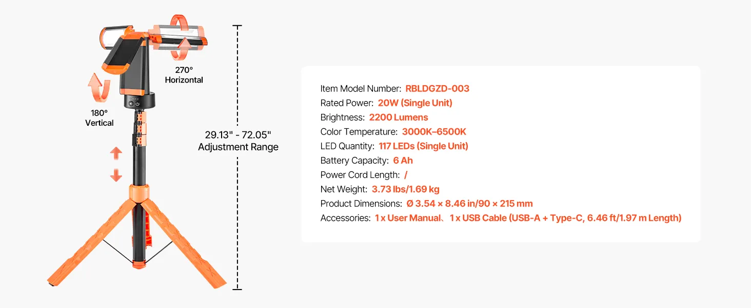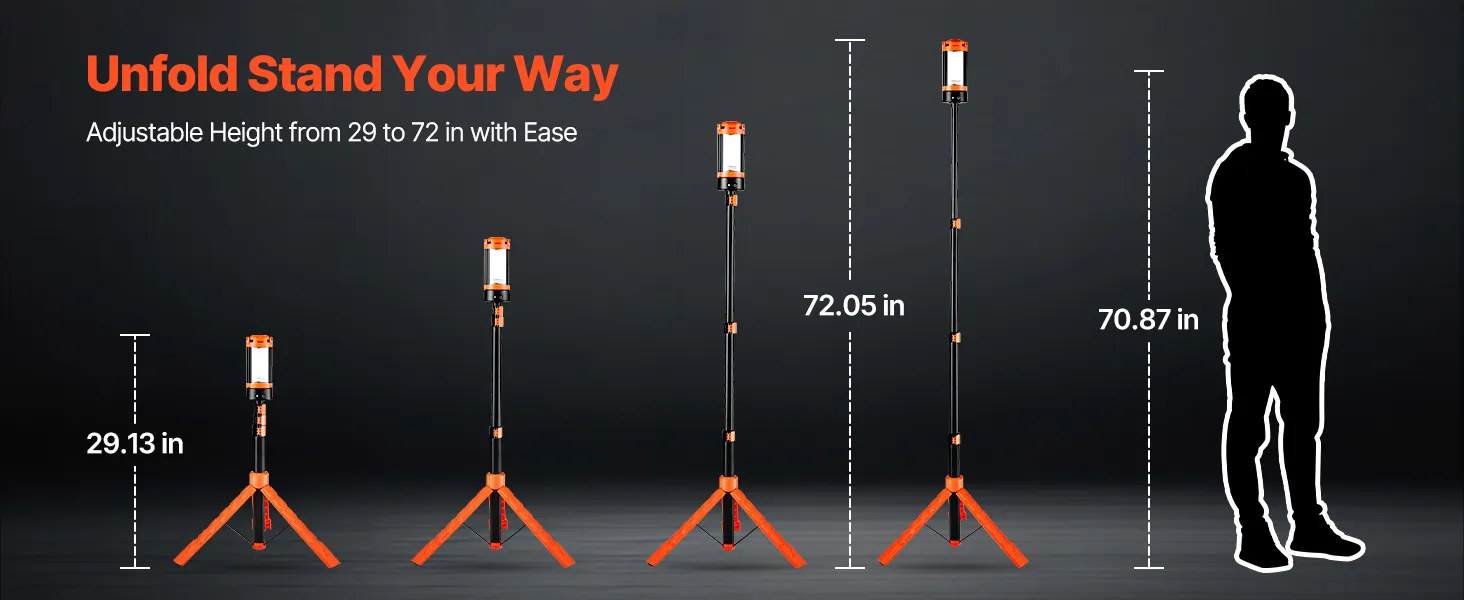 With a foldable tripod stand, the LED work light is height adjustable and quick to install without complicated steps. The tripod stand supports flexible adjustment from 29.13 in to 72.05 in for quick setup of lighting angles.