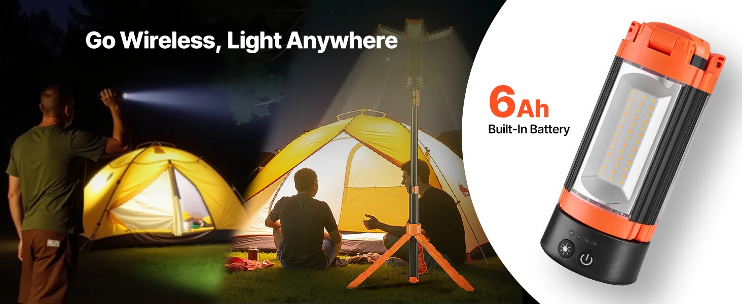 Equipped with a built-in 6 Ah battery, this portable work light enables long-time lighting without an external power source. It is suitable for outdoor construction, camping, power outage emergencies, and more.