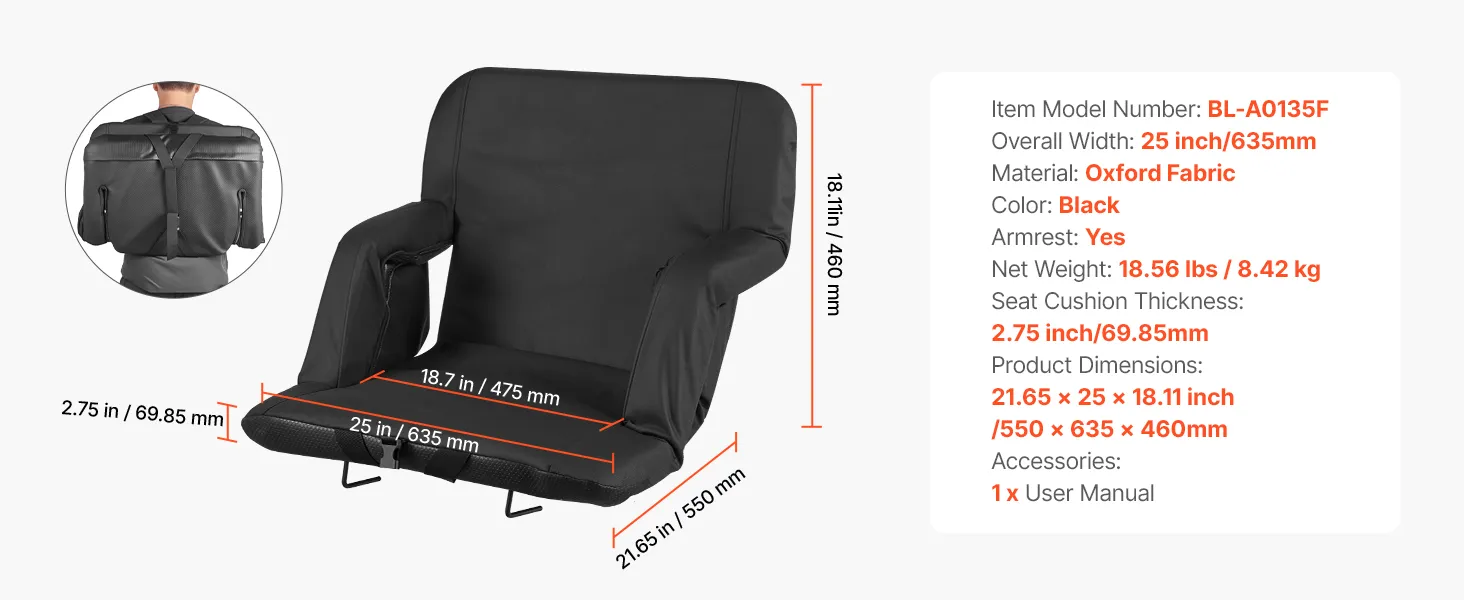 • Easy to Move: Featuring a foldable design, this portable reclining stadium seat can be packed into a backpack for hassle-free carrying. Suitable for professional games, parties, concerts, or picnics, it occupies minimal space and fits easily in a vehicle trunk