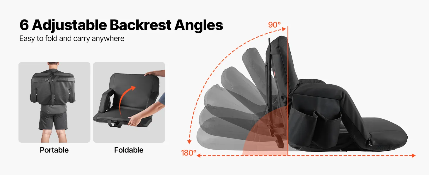 • Adjustable Back Angles: Enjoy six back angles with this VEVOR stadium chair: 90°, 105°, 130°, 145°, 160°, and 180°. Push the seat forward to its first stop, then pull it backward to adjust to a flat or chosen reclining position, ideal for long hours of spectating