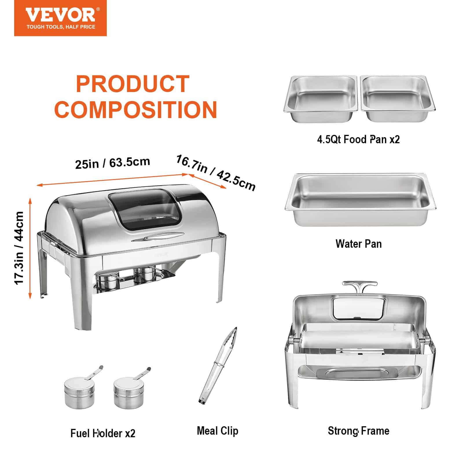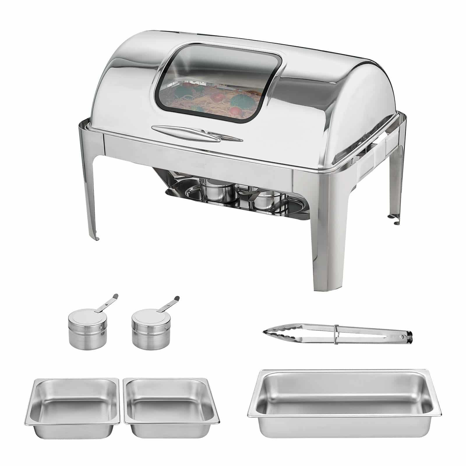 VEVOR Rectangle Roll Top Chafing Dish with 8.5L Pan Visual Glass Lid Fuel Holder