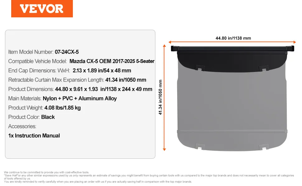 VEVOR Retractable Cargo Cover for Mazda CX-5 2017-2024 Upgraded Rear Trunk Cover
