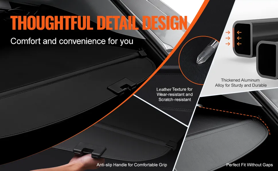 The main body of the retractable cargo cover is made of thickened aluminum alloy for enhanced durability, anti-slip handle design for comfortable grip, and a leather texture surface that is wear-resistant and scratch-resistant.