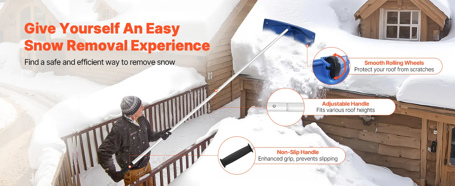 With an adjustable length, this roof snow rake lets you easily clear snow accumulated on roofs without the danger of climbing ladders. It comes with smooth rollers to avoid roof scratches, and the non-slip handle ensures a secure grip in slippery conditions.