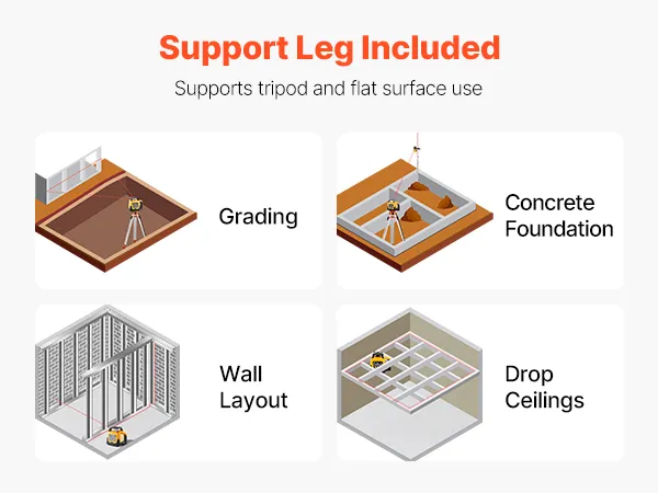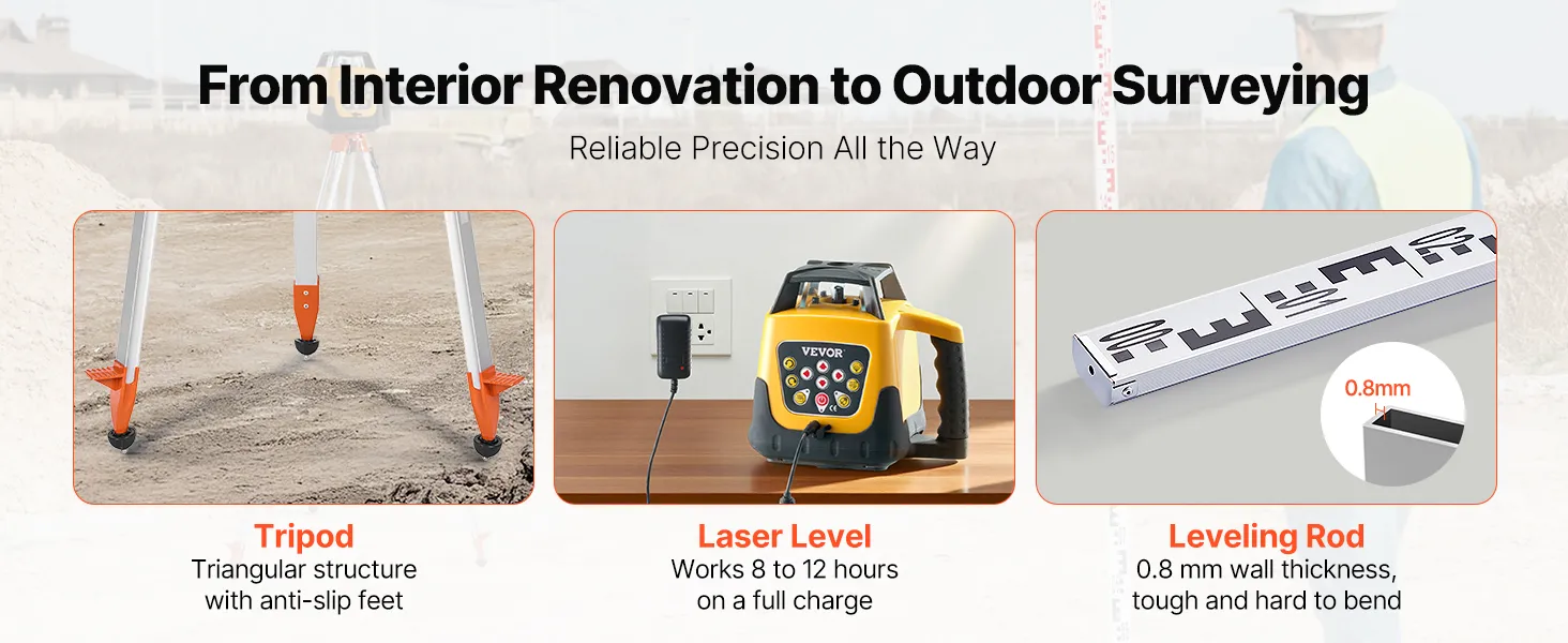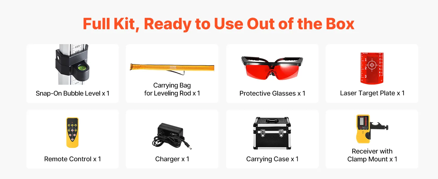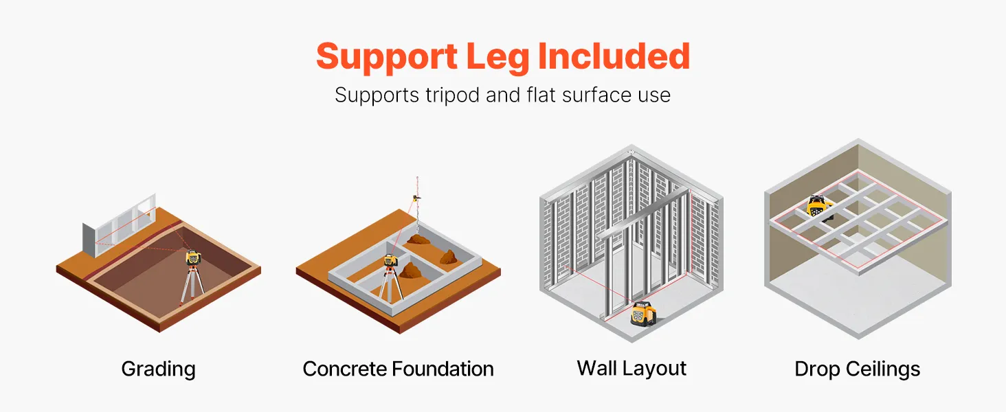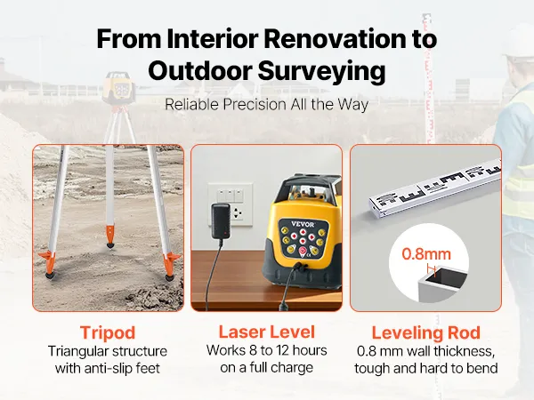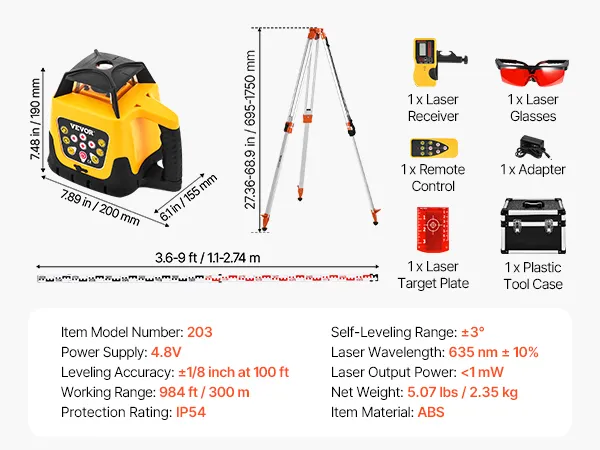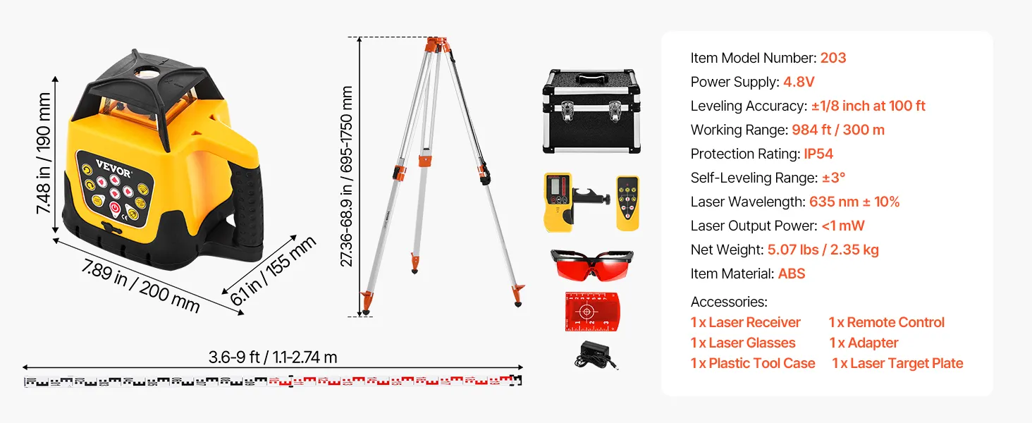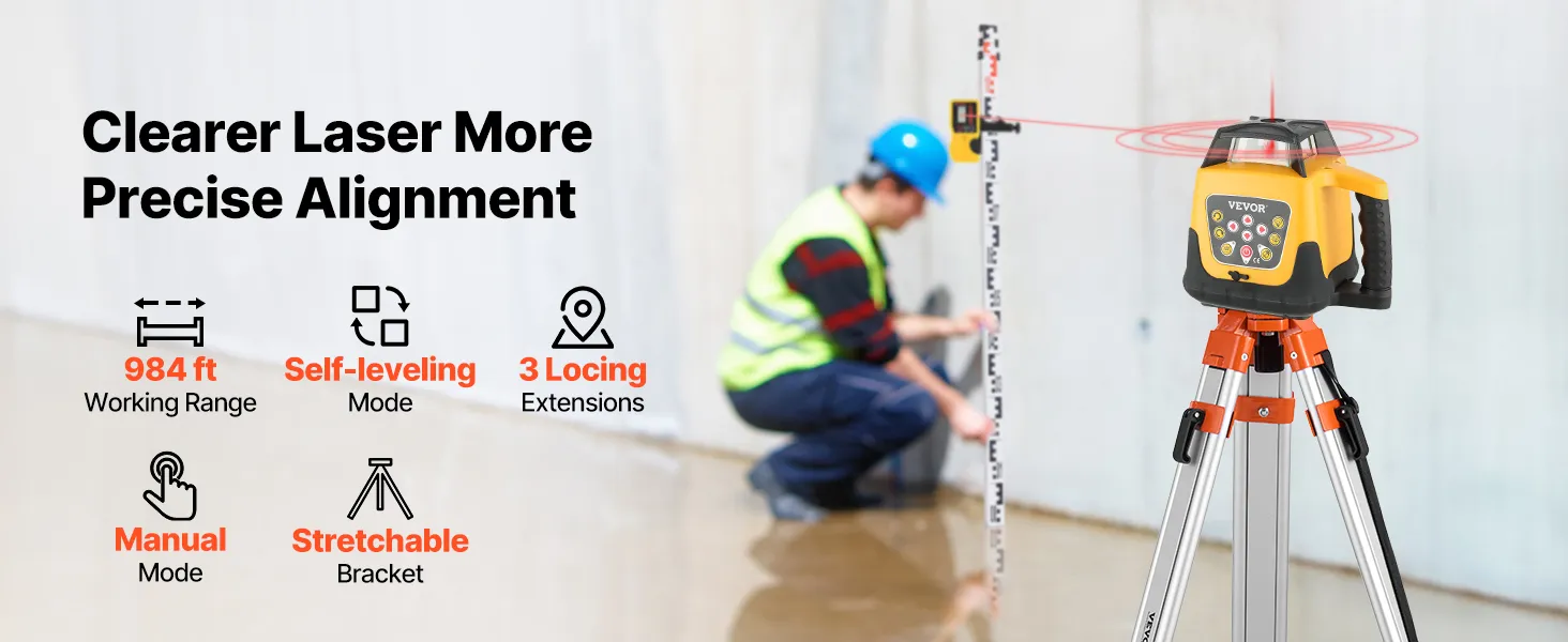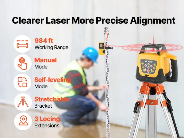 • 300 m Working Distance: Our rotating laser level has a 984 ft / 300 m working distance and clear laser output for industrial and commercial applications. It comes with a tripod and a staff gauge to help you accurately capture and interpret laser signals