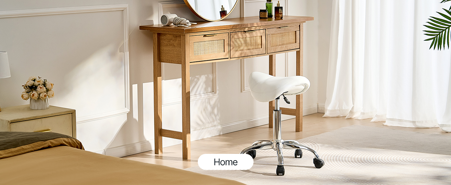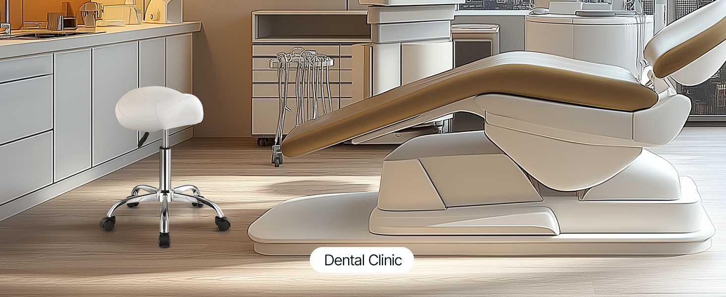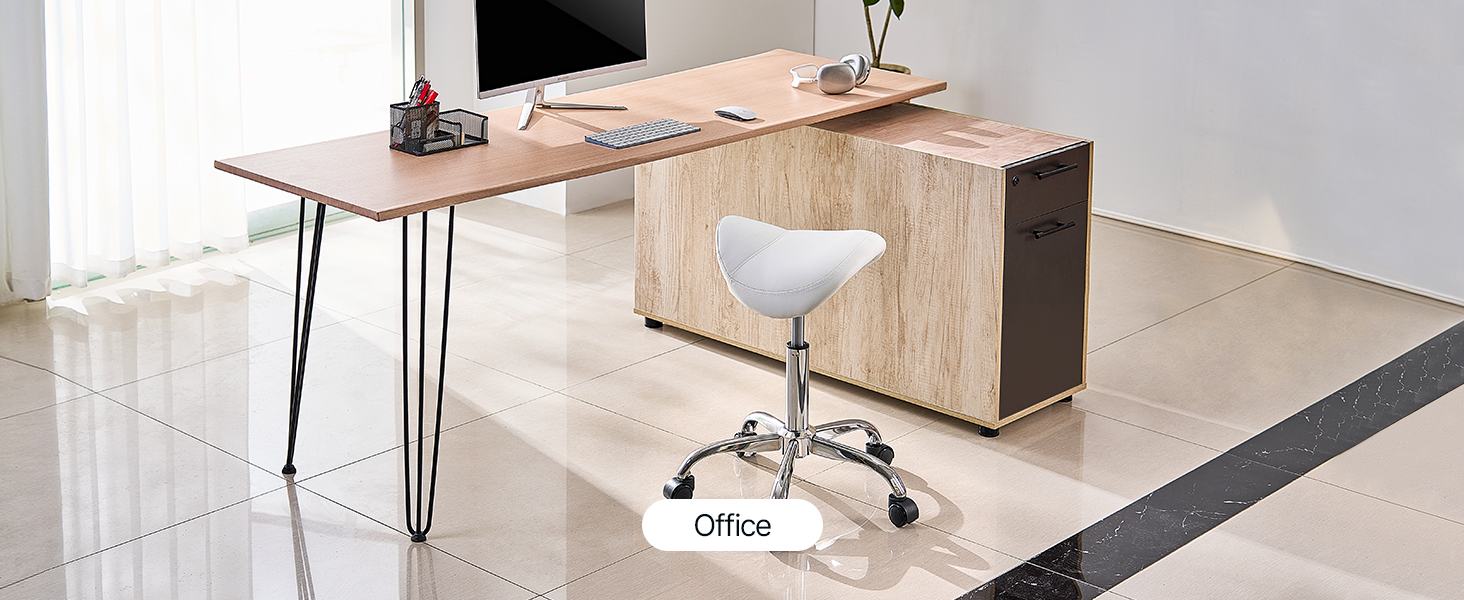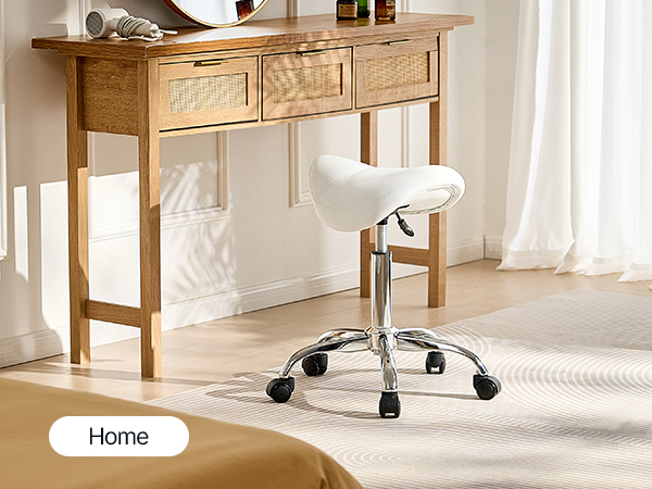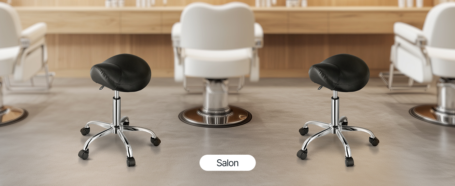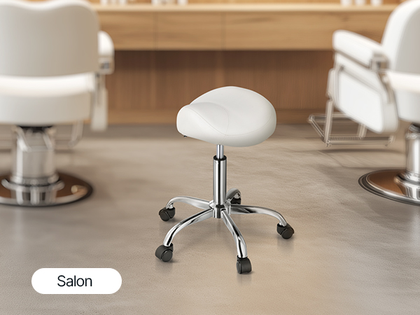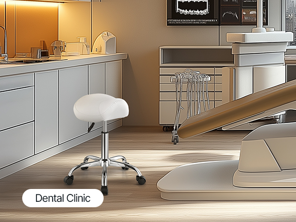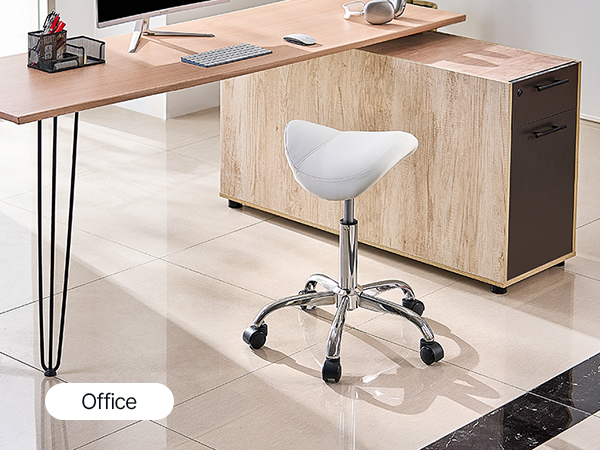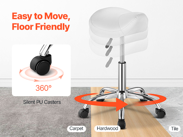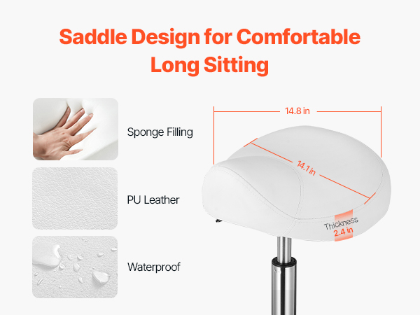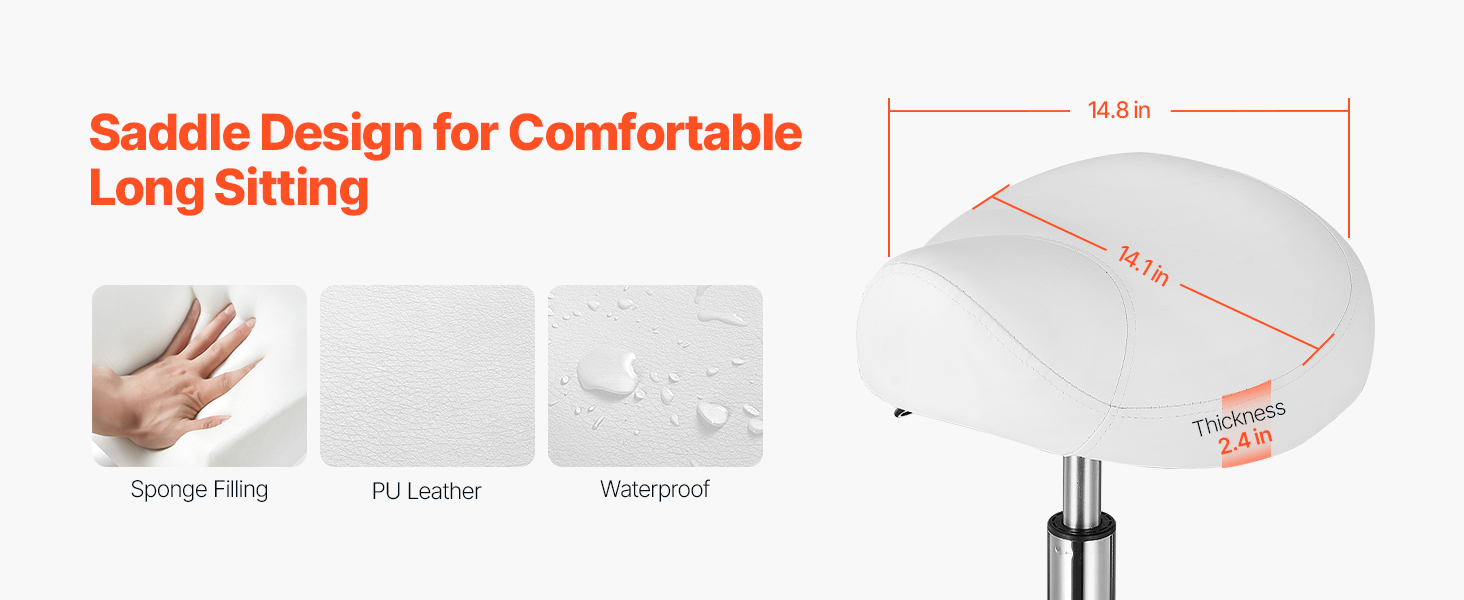 Our rolling stool is made of high-density compressed foam. The cushion measures 14.8 x14.1 in with a thickness of 2.4 in, and the leather seat is waterproof and breathable, providing extra comfort for long periods of sitting.