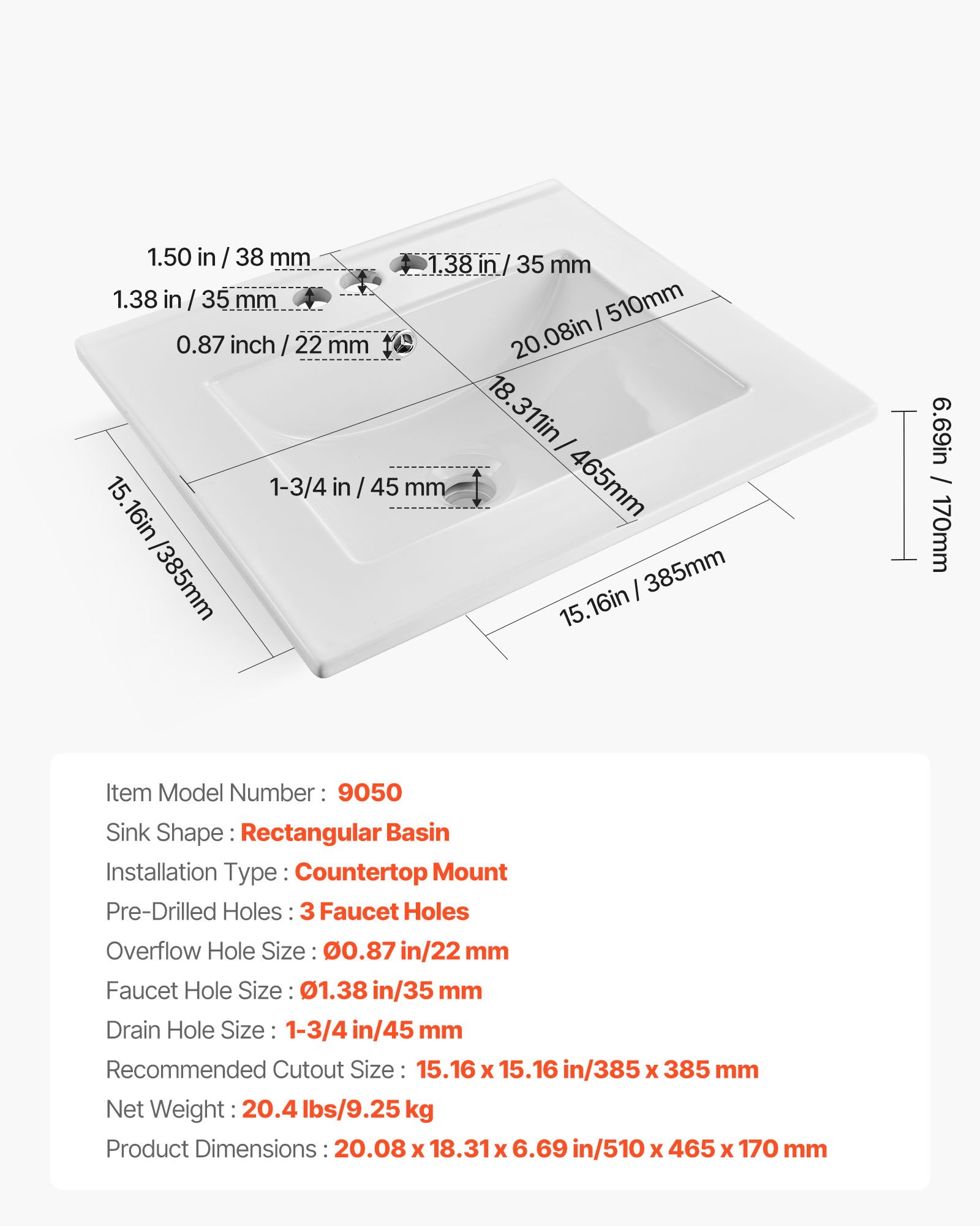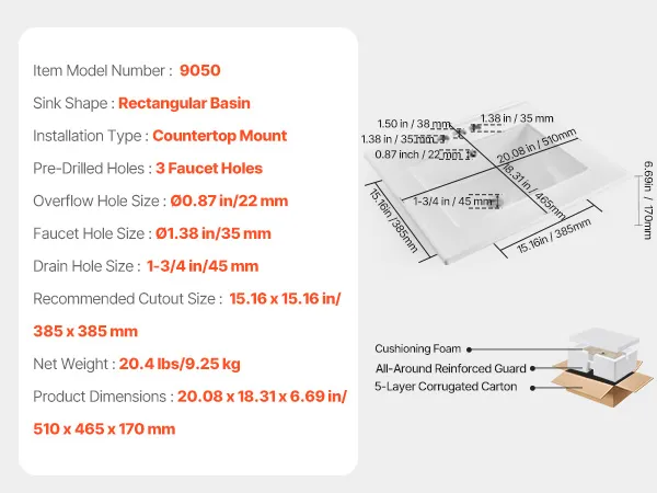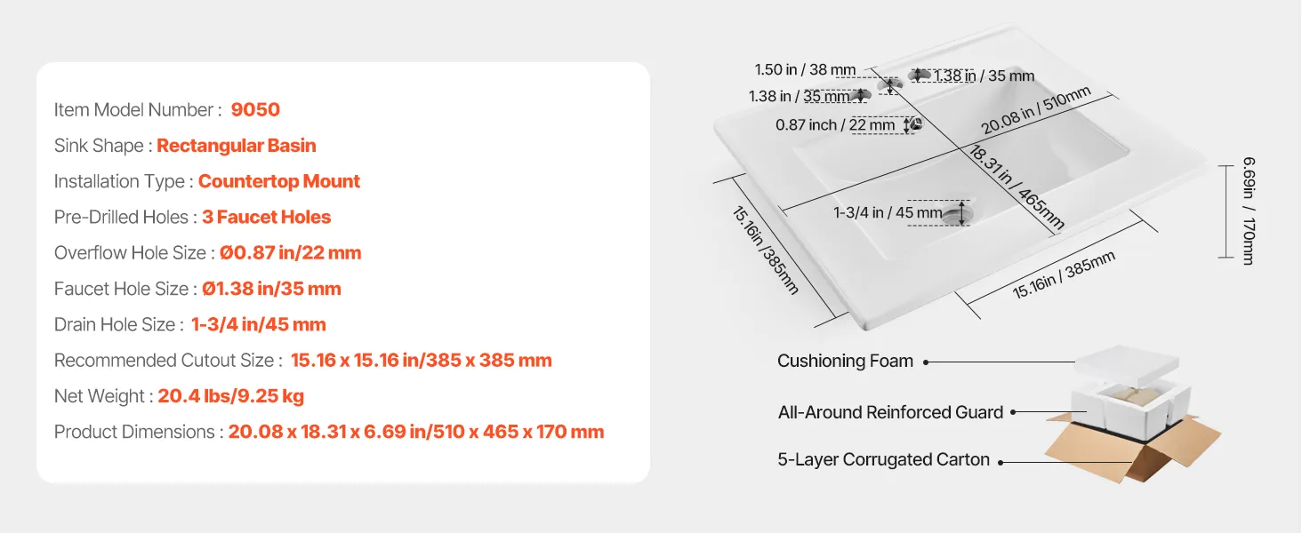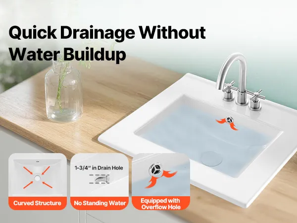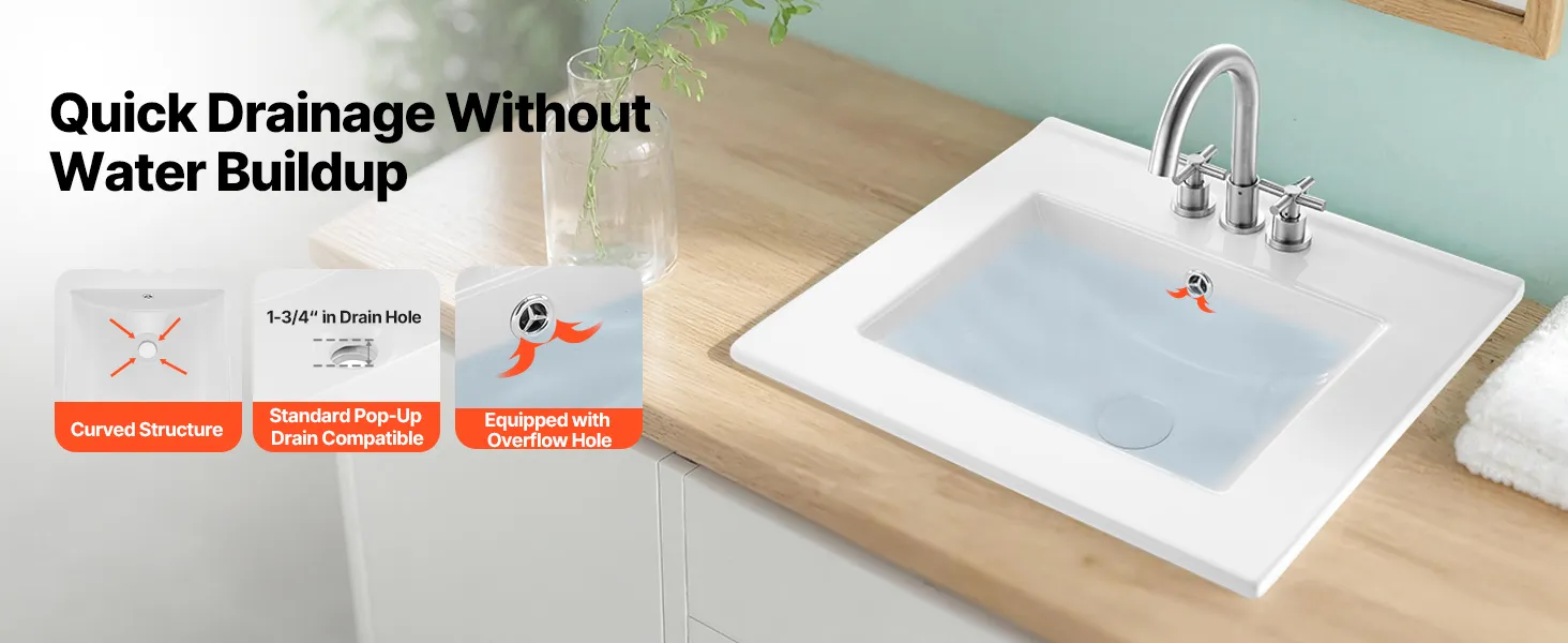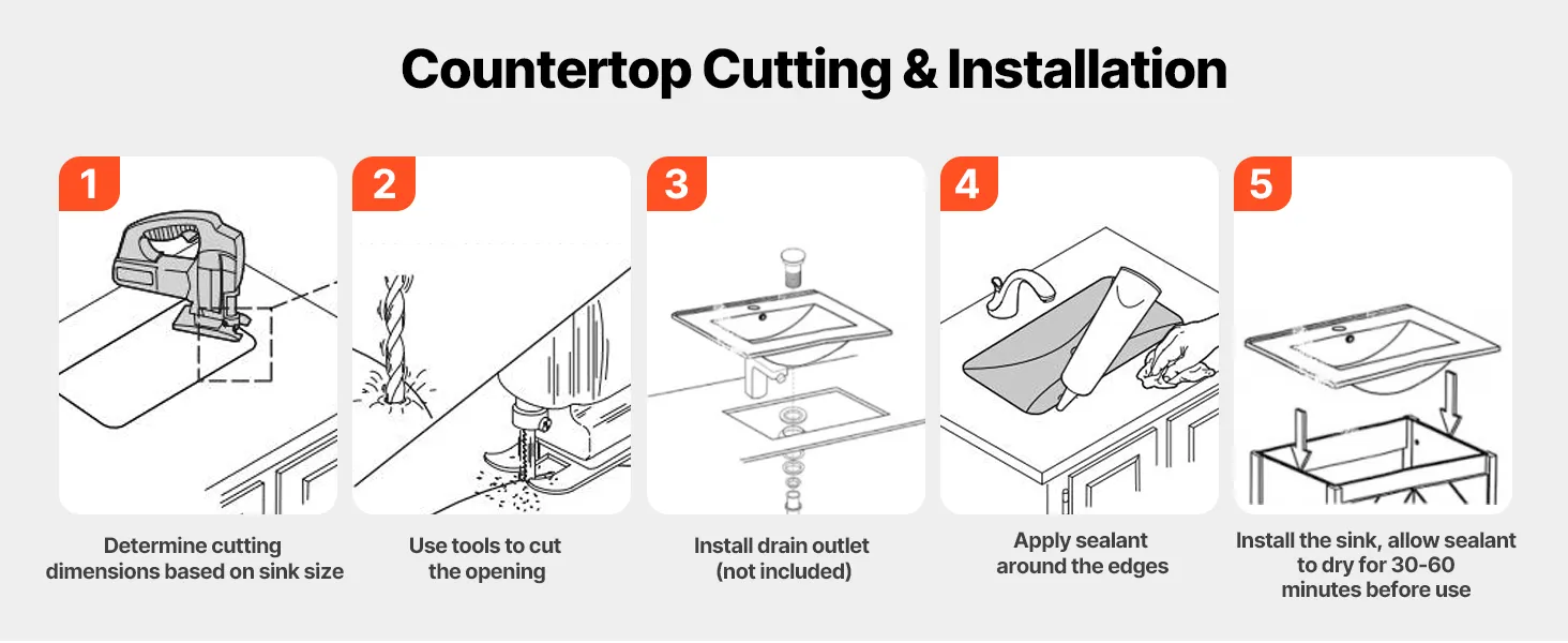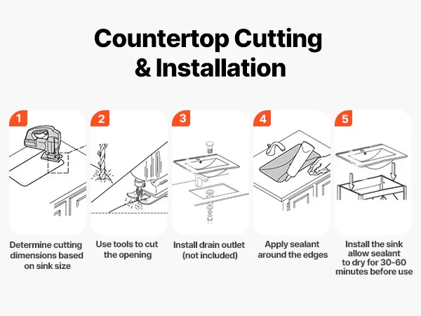 This drop in bathroom sink requires precise countertop cutouts before setup. It is recommended to use professional measurement and cutting based on the actual sink dimensions. Be sure to seal the edges securely to avoid damage caused by seeping water.