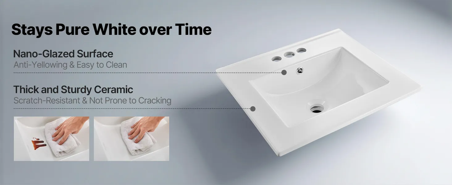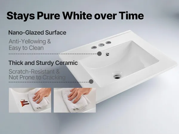 Fired at high temperatures for durability, this ceramic bathroom sink is coated with a nano-glaze layer that resists water stains, soap scum, and scratches. It stays bright and smooth over time, making everyday cleaning quick and effortless.