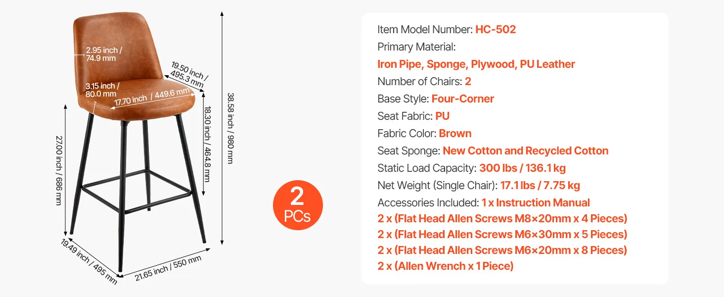 • Practical Set: The set includes 2 bar stools, each measuring 19.49×21.65×38.58 in, with a seat height of 27in. This bar chair is ideal for two-person households or open kitchen layouts, transitioning between dining, socializing, and office activities