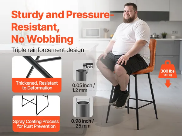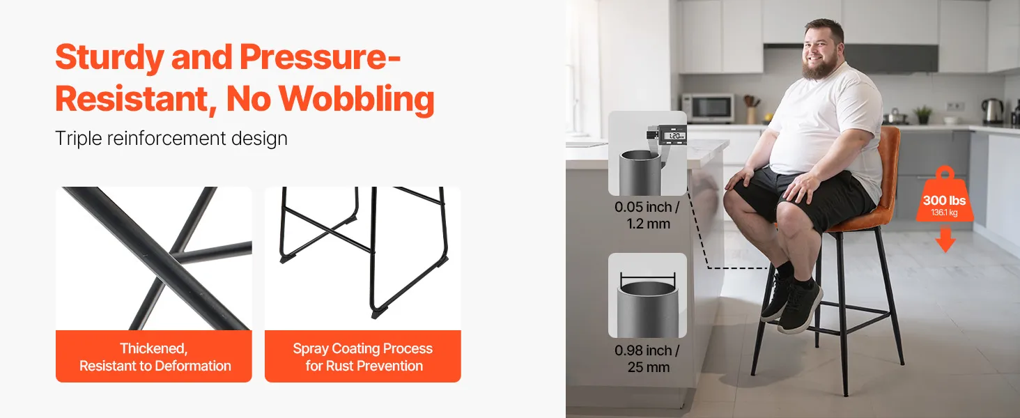 • Strong and Stable Weight Support: The bar stools feature thickened iron pipes with stable structure, offering a maximum weight capacity of up to 300 lbs / 136 kg. The stool legs are coated with a spray finish for rust and scratch resistance