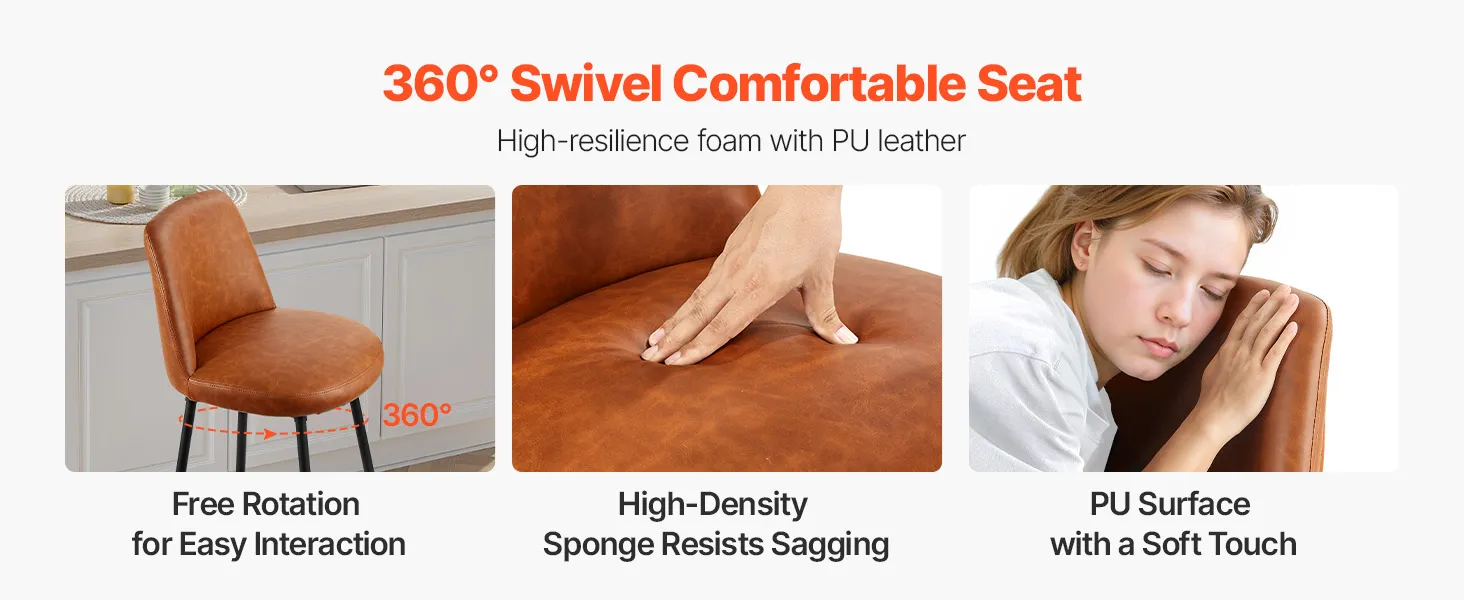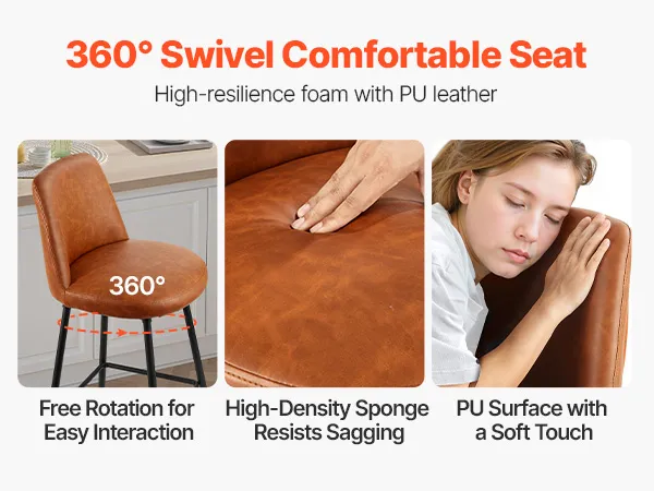 • Comfortable and Rotatable: Equipped with a 360° swivel design, the barstool allows easy interaction. The seat cushion is filled with high-density composite foam and covered in PU leather. The thick backrest fits comfortably to your back