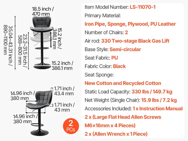• Practical Set: The set includes 2 bar stools, each measuring 18.50×21.06×35.04/43.31 in, with a seat height of 23.2-31.5 in. This bar chair is ideal for two-person households or open kitchen layouts, easily transitioning between dining, socializing, and office activities