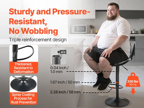 • Strong and Stable Weight Support: The bar stools feature thickened iron pipes with stable structure, offering a maximum weight capacity of up to 330 lbs / 150 kg. The stool legs are coated with a spray finish for rust and scratch resistance