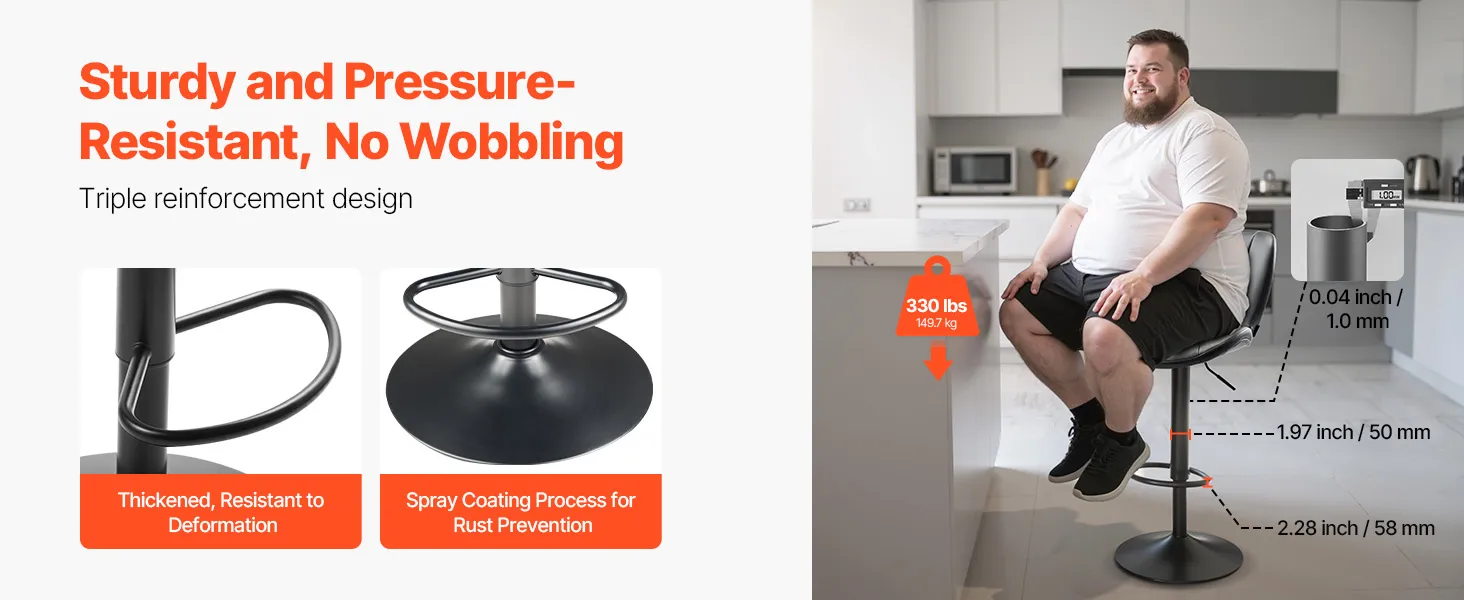 With thickened iron pipes and horn-shaped base with circular structure, this kitchen counter barstool offers exceptional support that prevents wobbling or sagging. It features a rust-resistant spray coating process, ensuring greater stability and durability.