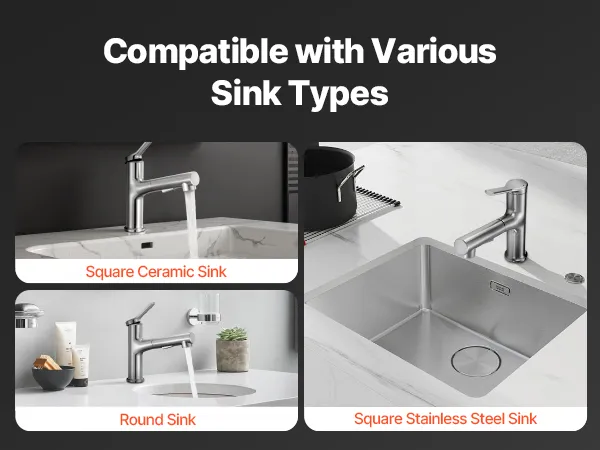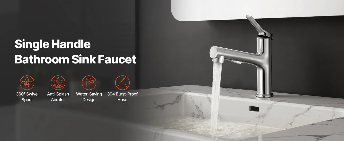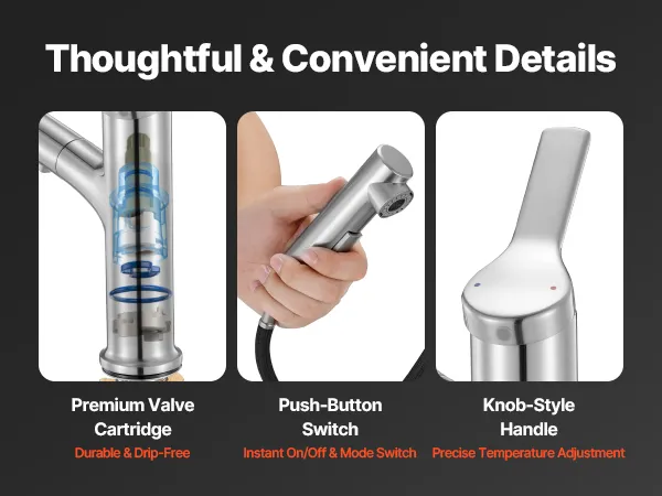 • Switchable Water Modes: Designed with a 360° rotating pull-down sprayer, our pull-down kitchen sink faucet reaches every part of your sink for efficient cleaning. With a button switch, you can easily toggle between water modes to handle different cleaning requirements with ease and convenience