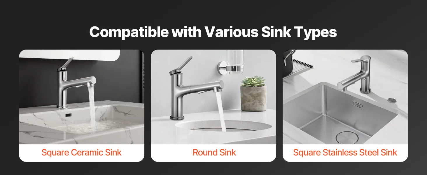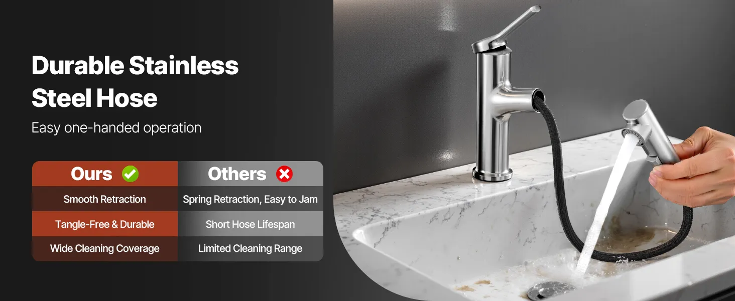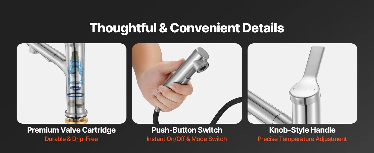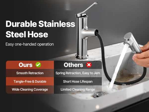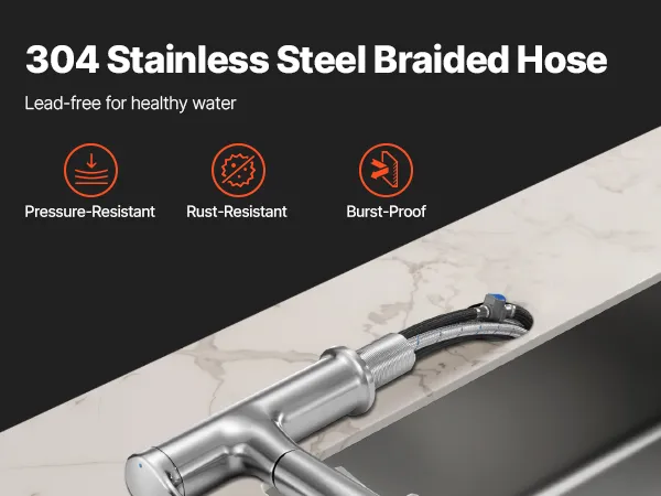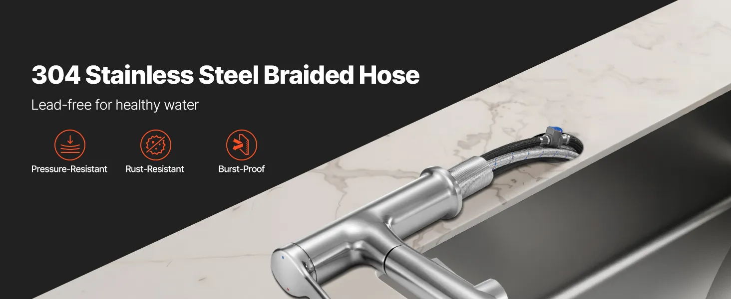 • Long-Term Durability: Built with a 304 stainless steel braided hose, this sink faucet with sprayer is highly durable, preventing leaks and ensuring long-term use. Its corrosion- and acid-resistant properties make it ideal for different water quality environments, providing reliable performance