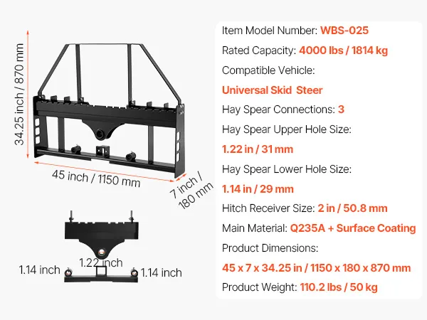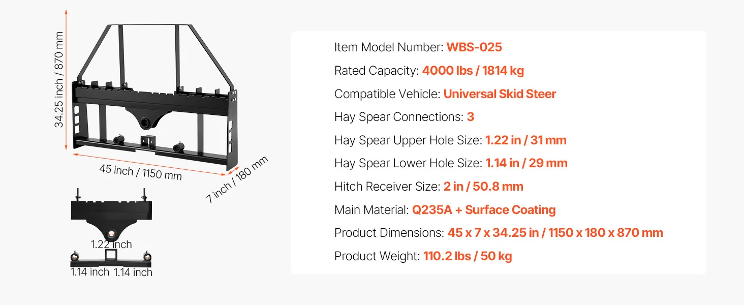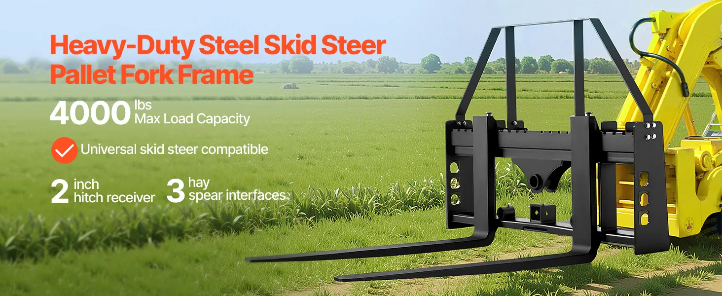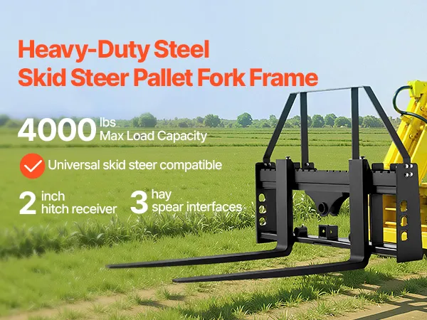 This 4000 lbs-rated pallet forks frame fits most skid steers and tractors. Ideal for moving hay bales, building materials, and more on farms, gardens, or construction sites. Efficient and reliable for heavy-duty tasks.