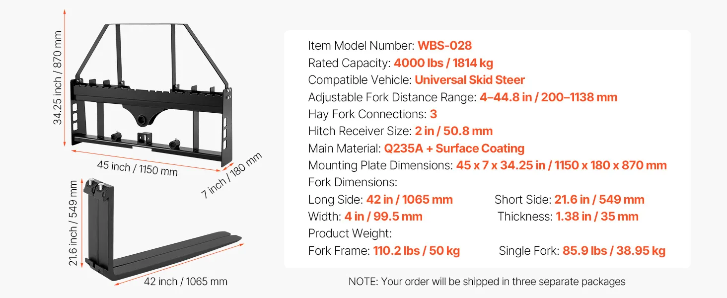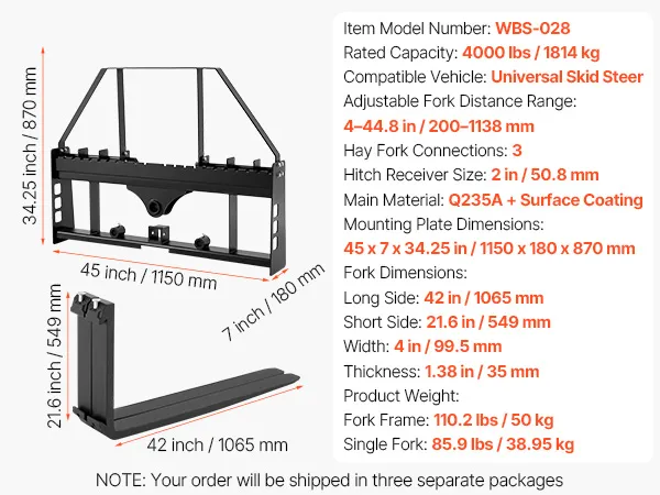 • Durable Steel Construction: Built to last! Our heavy-duty skid steer pallet forks and mounting plate are made from high-strength carbon steel, coated to resist corrosion and rust. Enjoy years of reliable, tough performance. NOTE: Your order will be shipped in 3 separate packages, track each one individually