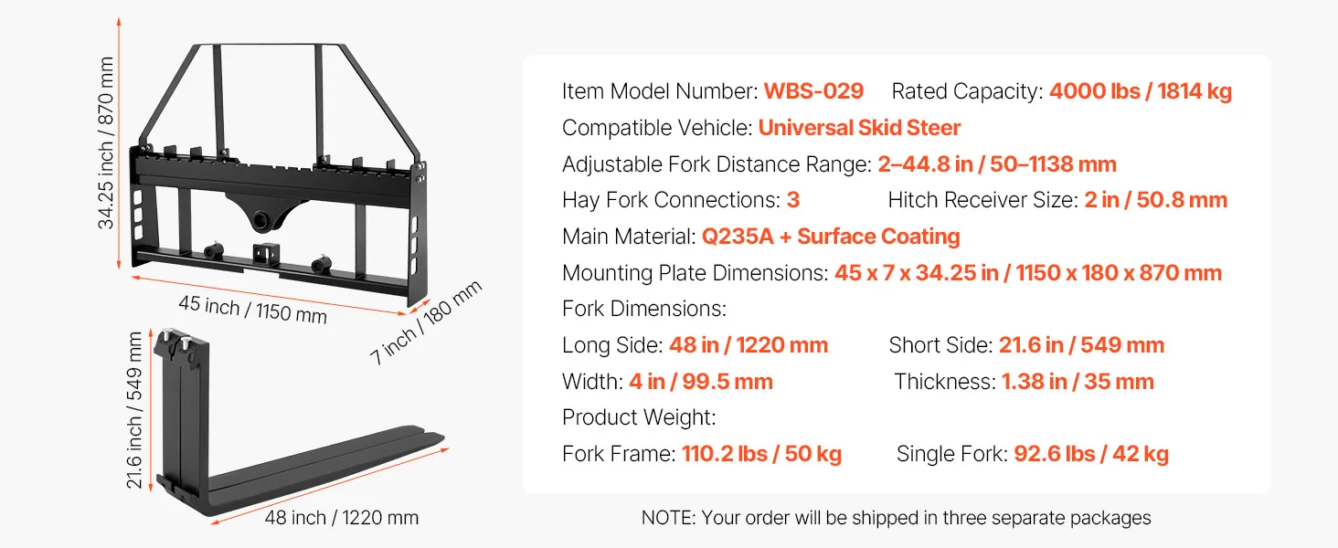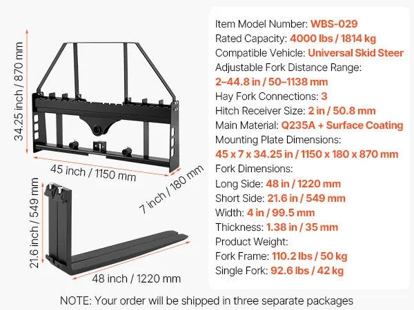 • Durable Steel Construction: Built to last! Our heavy-duty skid steer pallet forks and mounting plate are made from high-strength carbon steel, coated to resist corrosion and rust. Enjoy years of reliable, tough performance. NOTE: Your order will be shipped in 3 separate packages, track each one individually