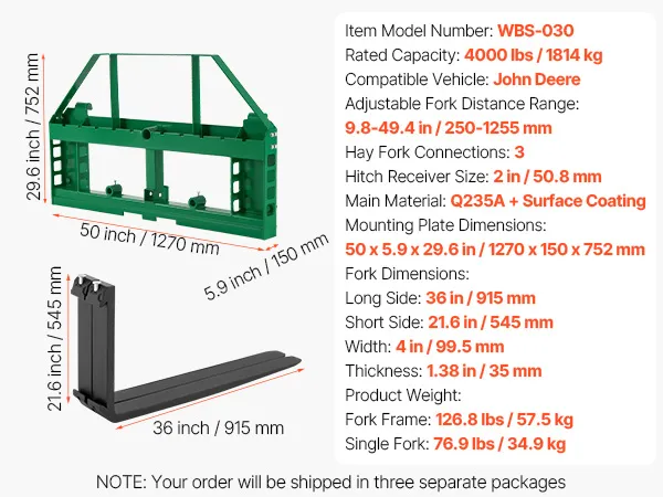 Our heavy-duty steel skid steer forks are rated for 4000 lbs and are designed for the John Deere tractors. Ideal for farm, garden, and construction tasks, moving hay bales, building materials, and more.