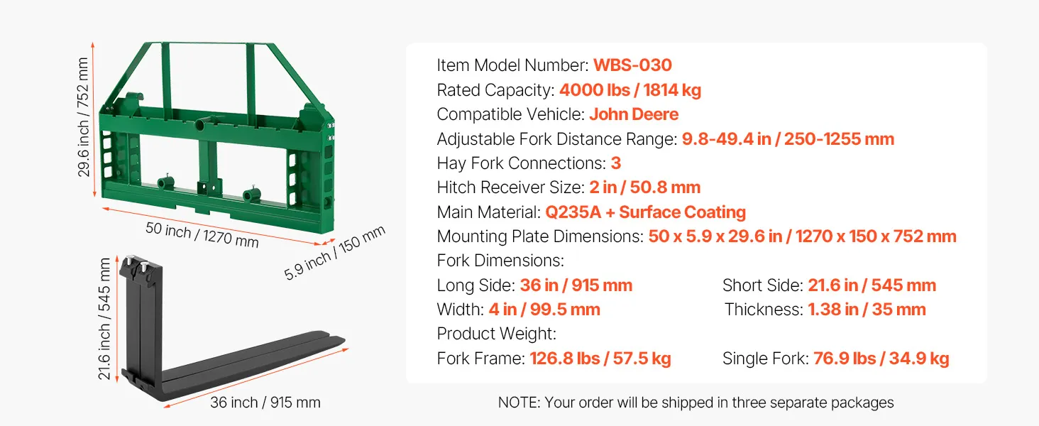 VEVOR Skid Steer Pallet Forks, 1814 kg Rated Load Capacity, Pallet Fork Frame Attachment with 915 mm Pallet Forks Forklift Blades, 50.8 mm Hitch Receiver & Spear Sleeves, Fit for JD Tractors