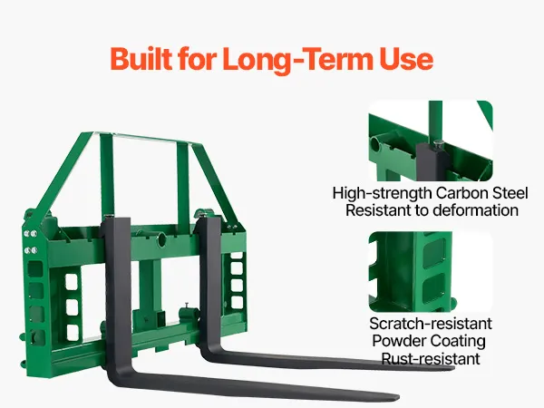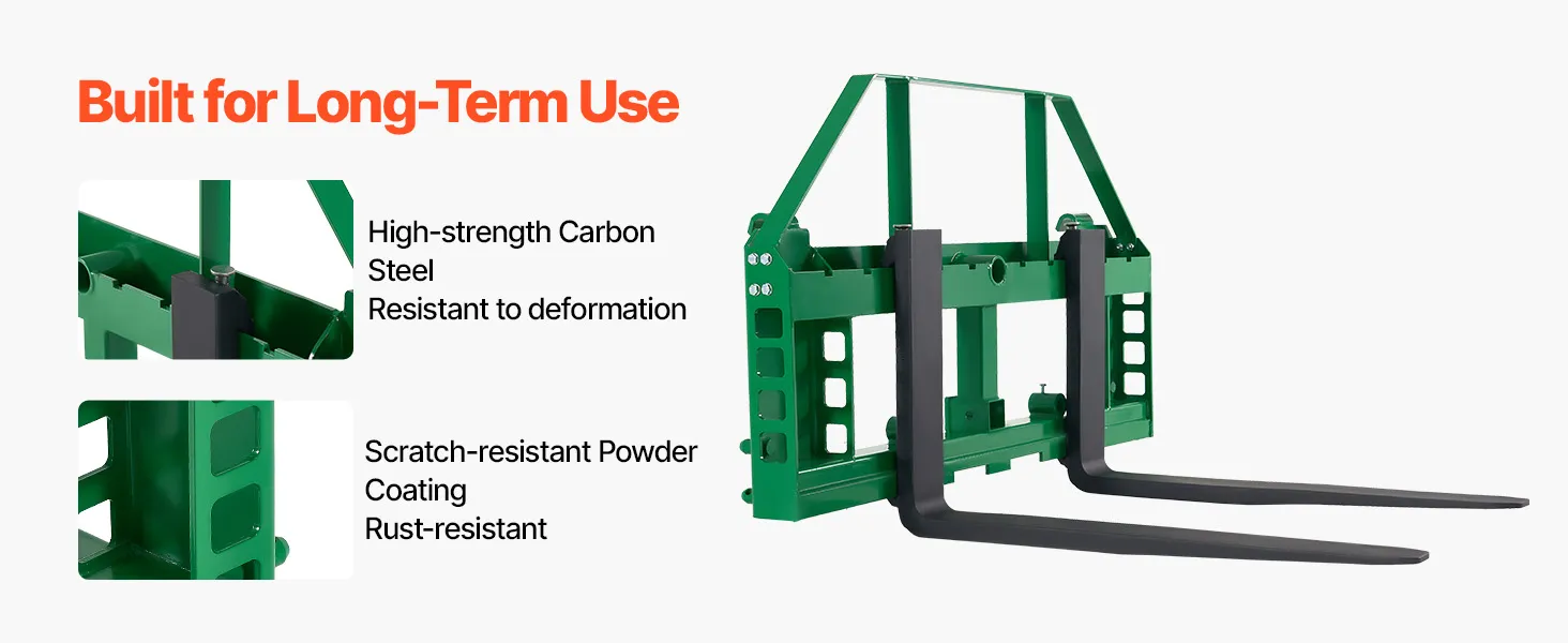 Our heavy-duty steel skid steer forks are rated for 4000 lbs and are designed for the John Deere tractors. Ideal for farm, garden, and construction tasks, moving hay bales, building materials, and more.