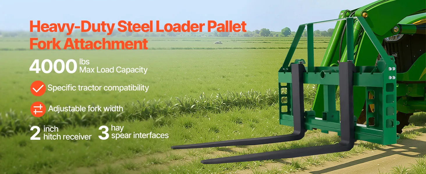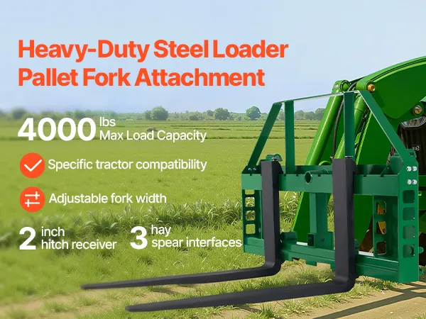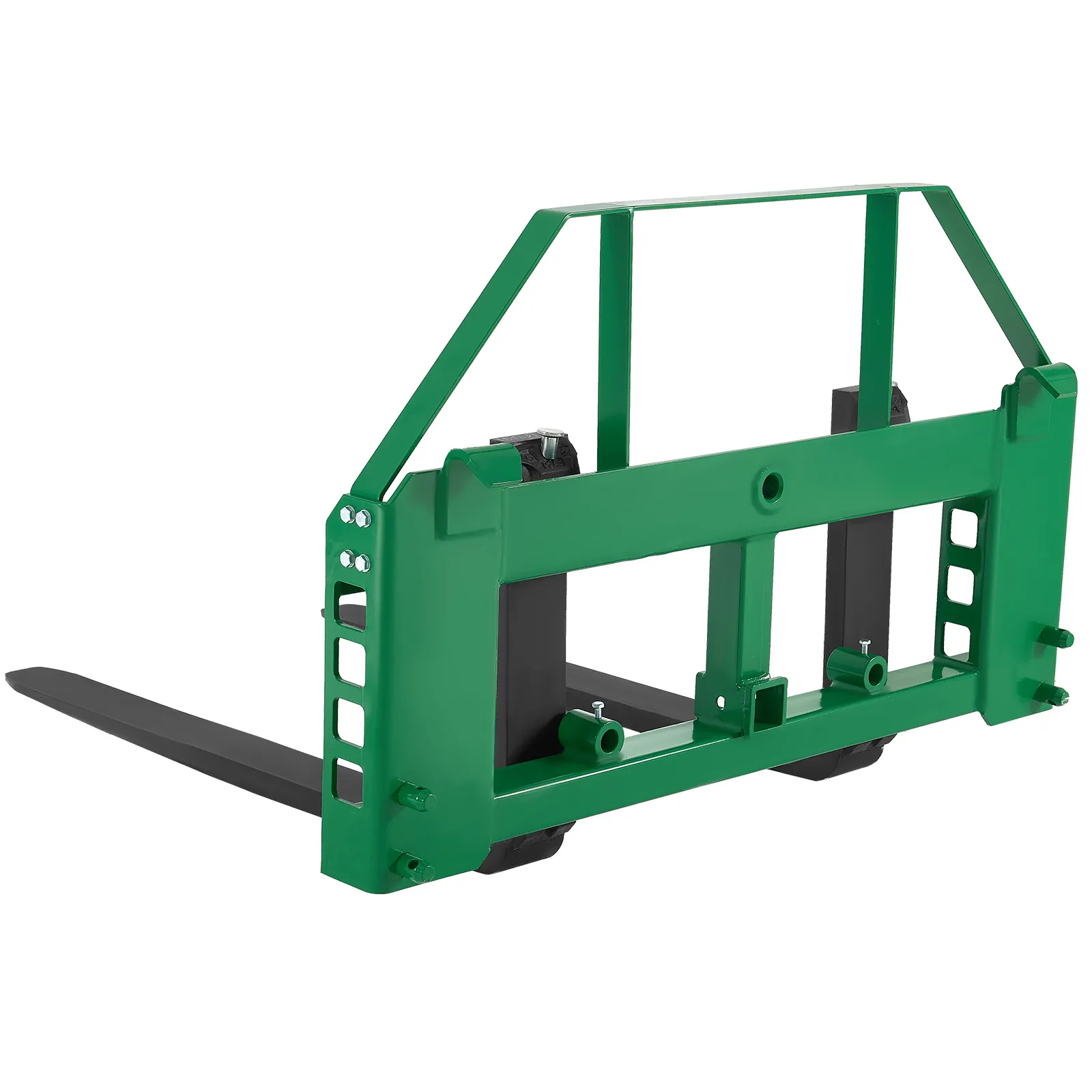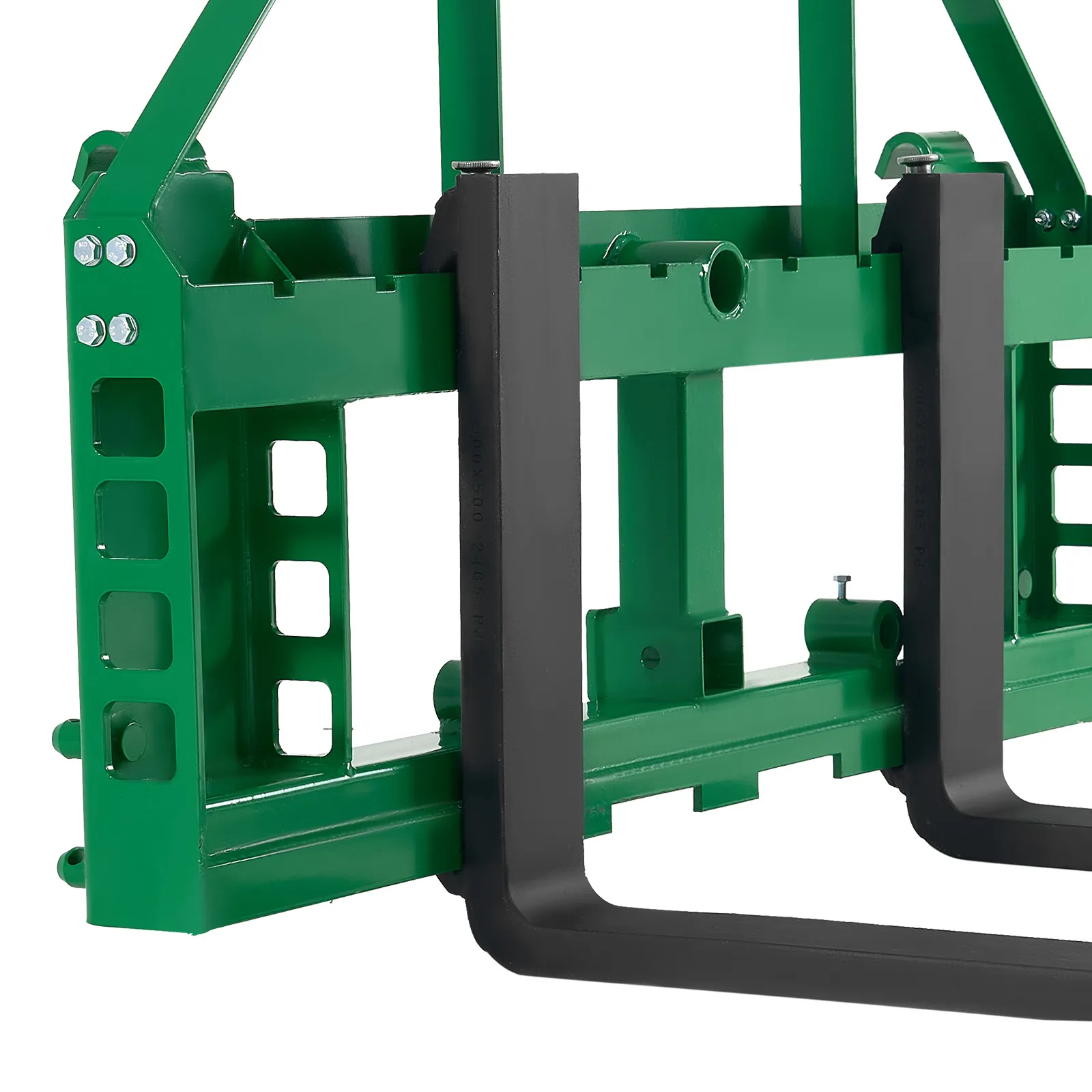 Our heavy-duty steel skid steer forks are rated for 4000 lbs and are designed for the John Deere tractors. Ideal for farm, garden, and construction tasks, moving hay bales, building materials, and more.