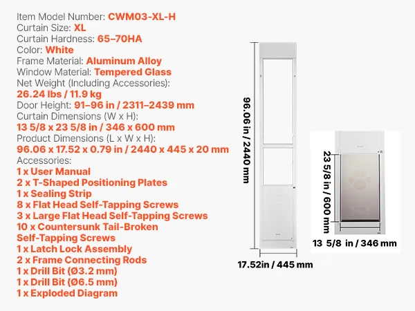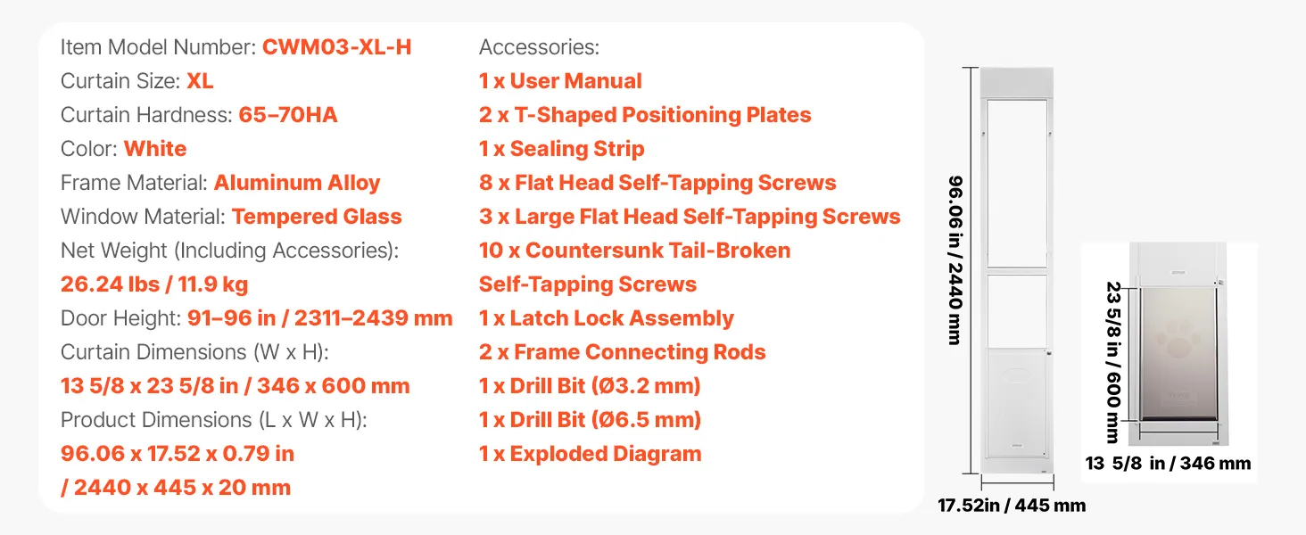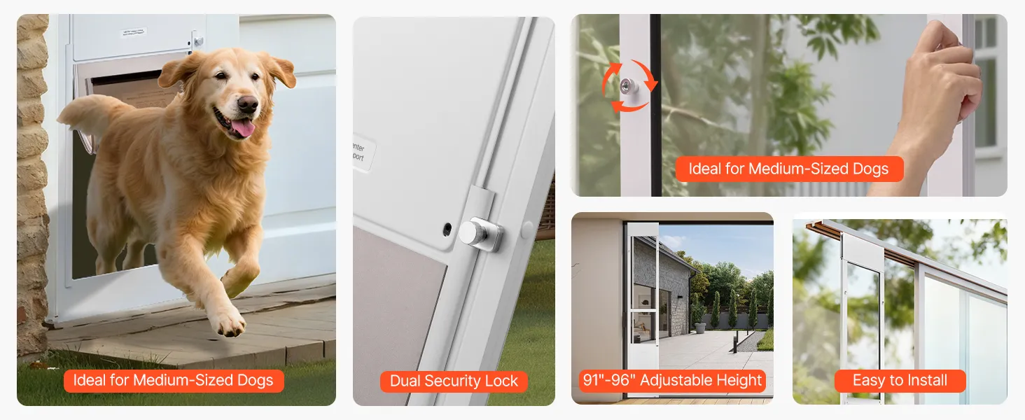 VEVOR Dog Door for Sliding Glass Door, 2311-2439 mm Adjustable Height, Aluminum Alloy Frame with Metal Rotating Hinges, Secure Lock Design, 346 x 600 mm Flap, Sliding Glass Pet Door for Renters
