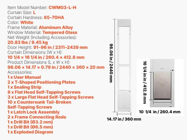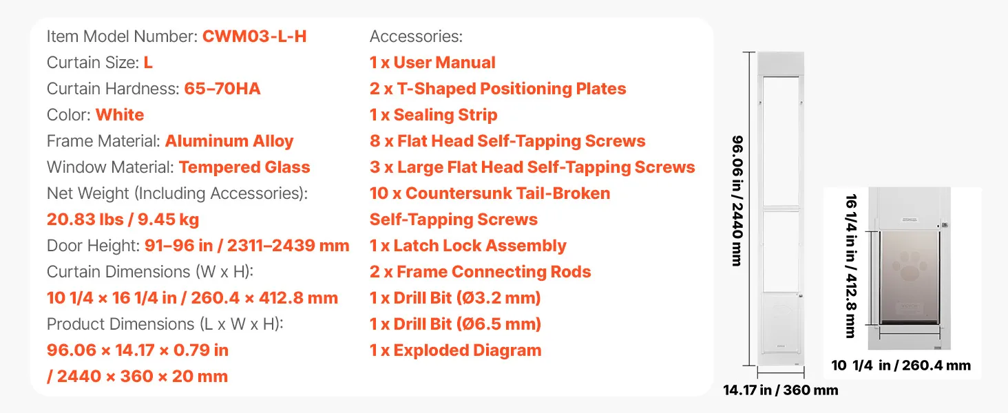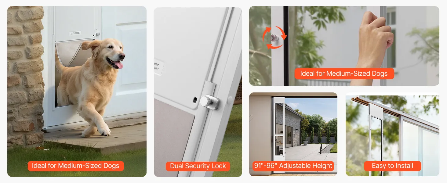 VEVOR Dog Door for Sliding Glass Door, 2311-2439 mm Adjustable Height, Aluminum Alloy Frame with Metal Rotating Hinges, Lock Design, 260.4 x 412.8 mm Flap, Sliding Glass Pet Door for Renters