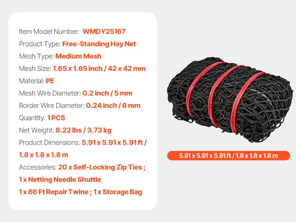 VEVOR Round Bale Hay Net, 1.8 x 1.8 x 1.8 m, 42 x 42 mm Holes, PE Material, Knotless Design, with Zip Ties, Needle Shuttle, Repair Twine and Storage Bag, Slow Feeder Round Bale Net for Horses