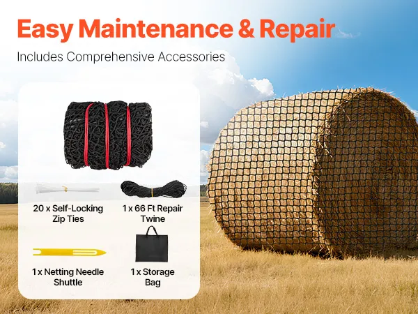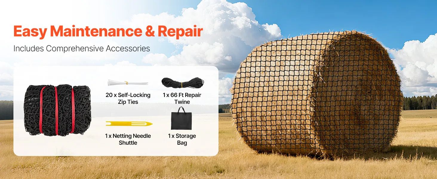 This hay bale net allows quick repairing and partial replacements with included repair accessories. It enables simple maintenance and extends lifespan, reducing replacement costs for long-term, cost-effective use.