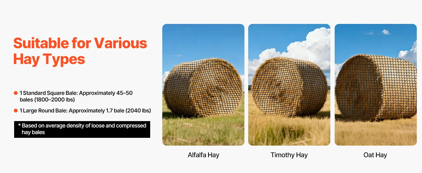 Our hay net for round bales fits various hay types, including alfalfa, timothy, and oat hay, supporting standard square and large round bales for flexible feeding and efficient livestock management.