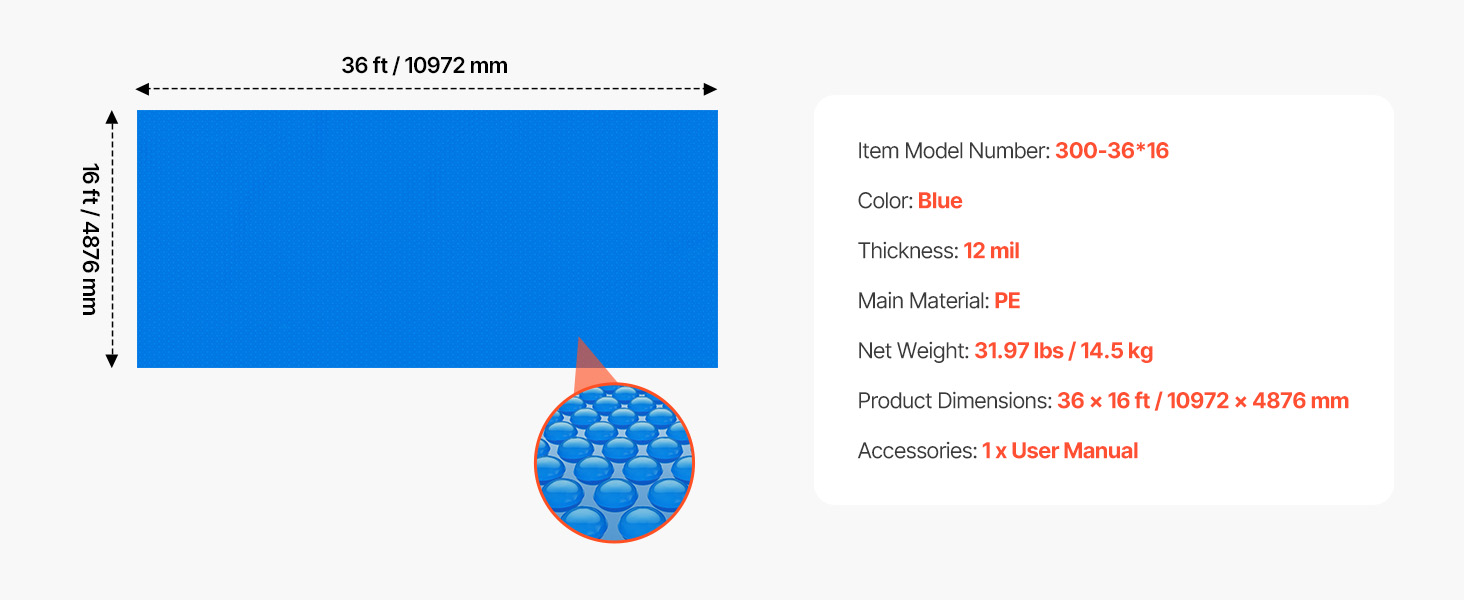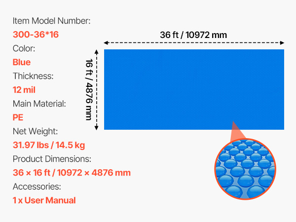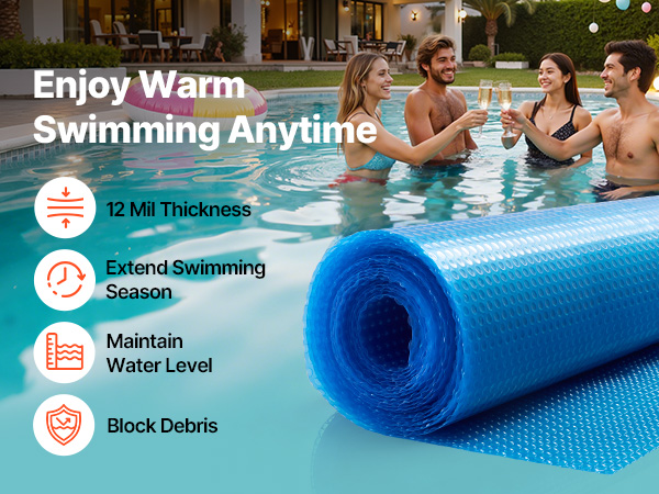 • Enjoy Longer Swims: Keep your pool warm with this 36 x 16ft/10.97 x 4.88m bubble solar blanket, 12 mil thick. It extends your swimming season by maintaining a comfortable water temperature. Easy installation and customizable to fit irregular pool shapes for an ideal solution