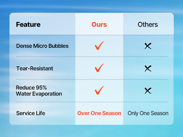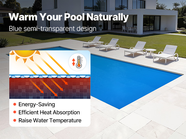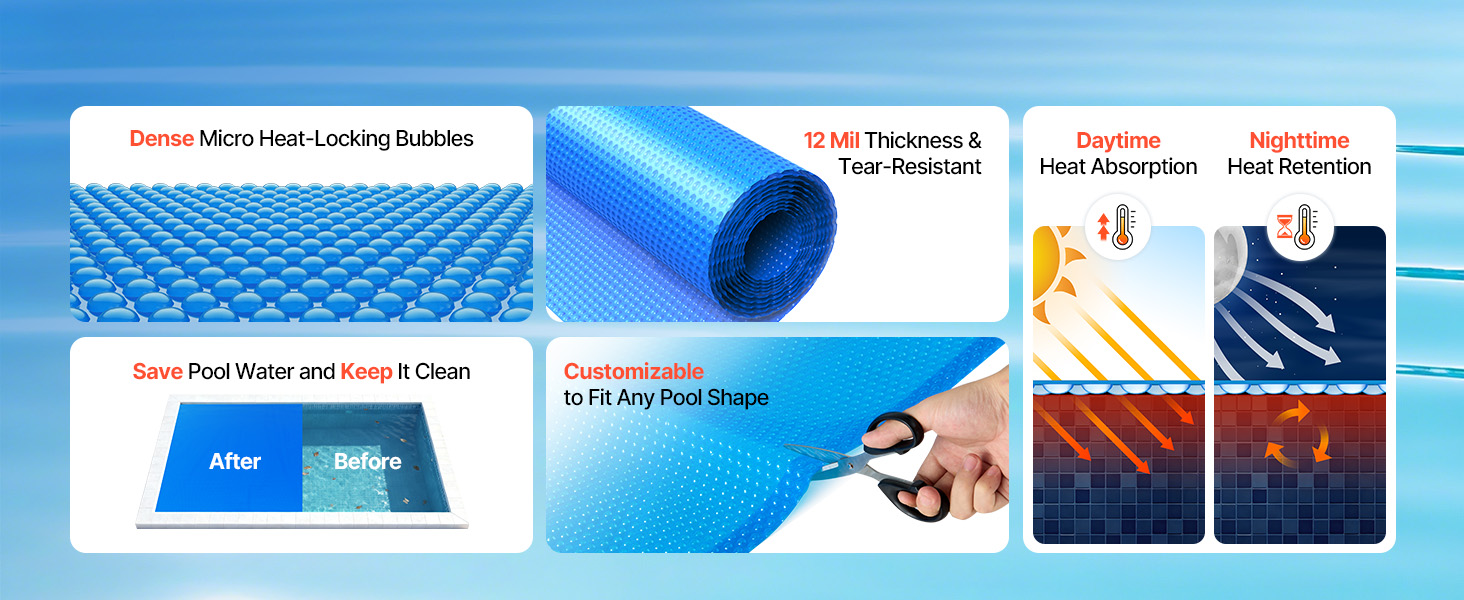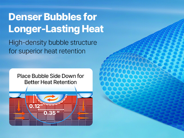 • Solar Heat Lock: This pool solar blanket absorbs natural sunlight through tightly packed micro bubbles, creating an effective heat retention layer. It heats the pool during the day and keeps it warm at night, reducing the need for extra energy to maintain water temperature