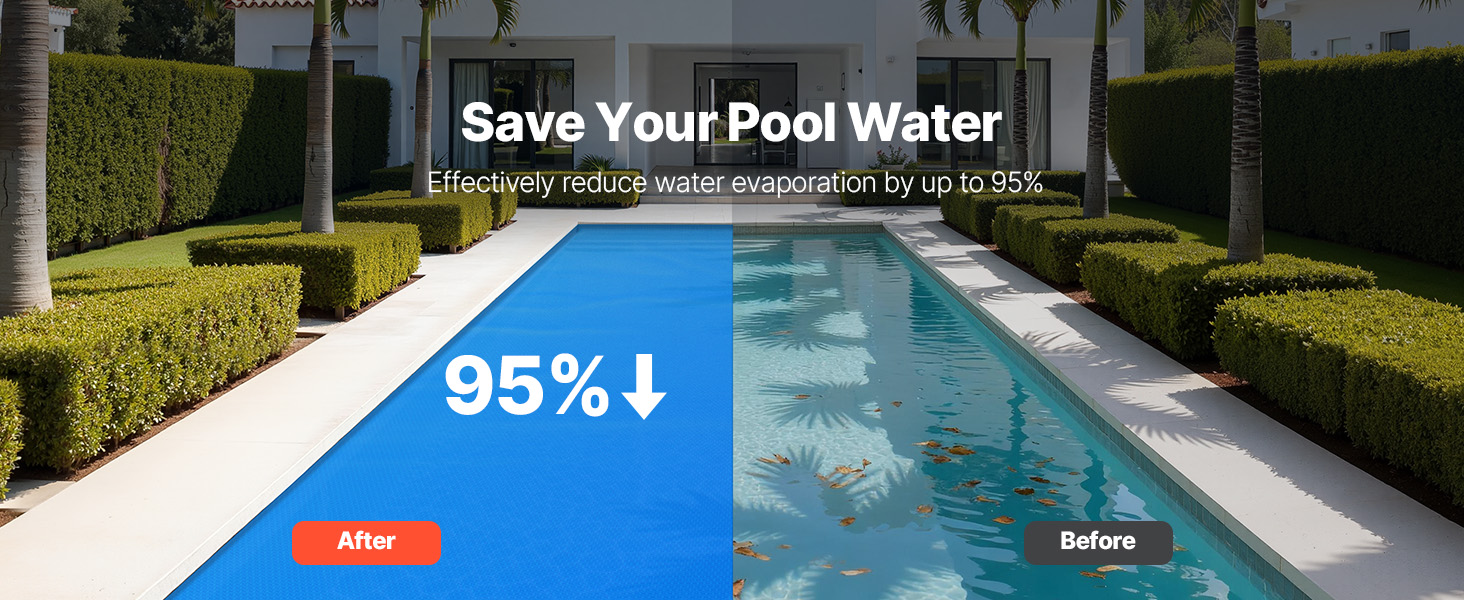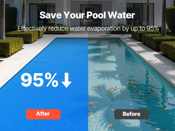 • Water & Energy Conservation: The inground pool solar cover effectively reduces water evaporation by up to 95%, meaning less frequent refills and more water conservation. It also helps slow the evaporation of chemicals, reducing the need for constant maintenance. Enjoy a more sustainable pool with less hassle