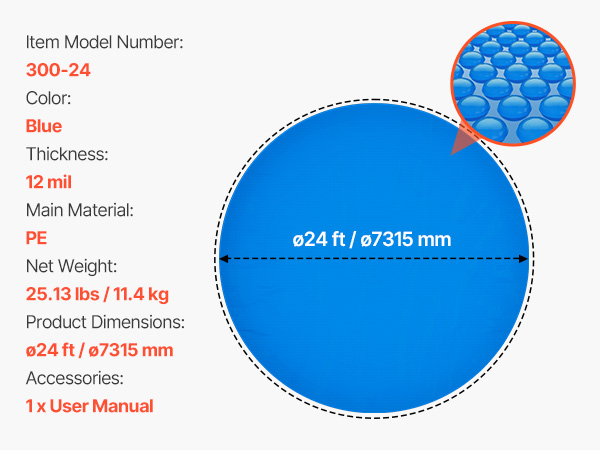 VEVOR Solar Pool Cover, 7.32m Round Pool Bubble Cover, 12 Mil Pools Solar Blanket with Bubble & PE Material, Daytime Heat Absorption, Nighttime Heat Retention, Heat Retaining Solars Covers, Blue