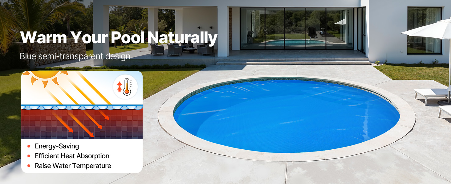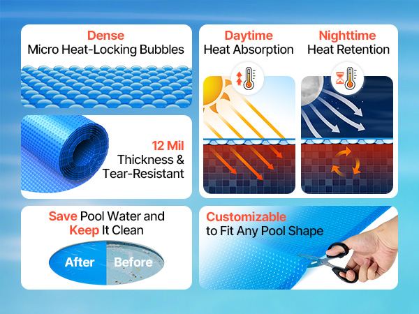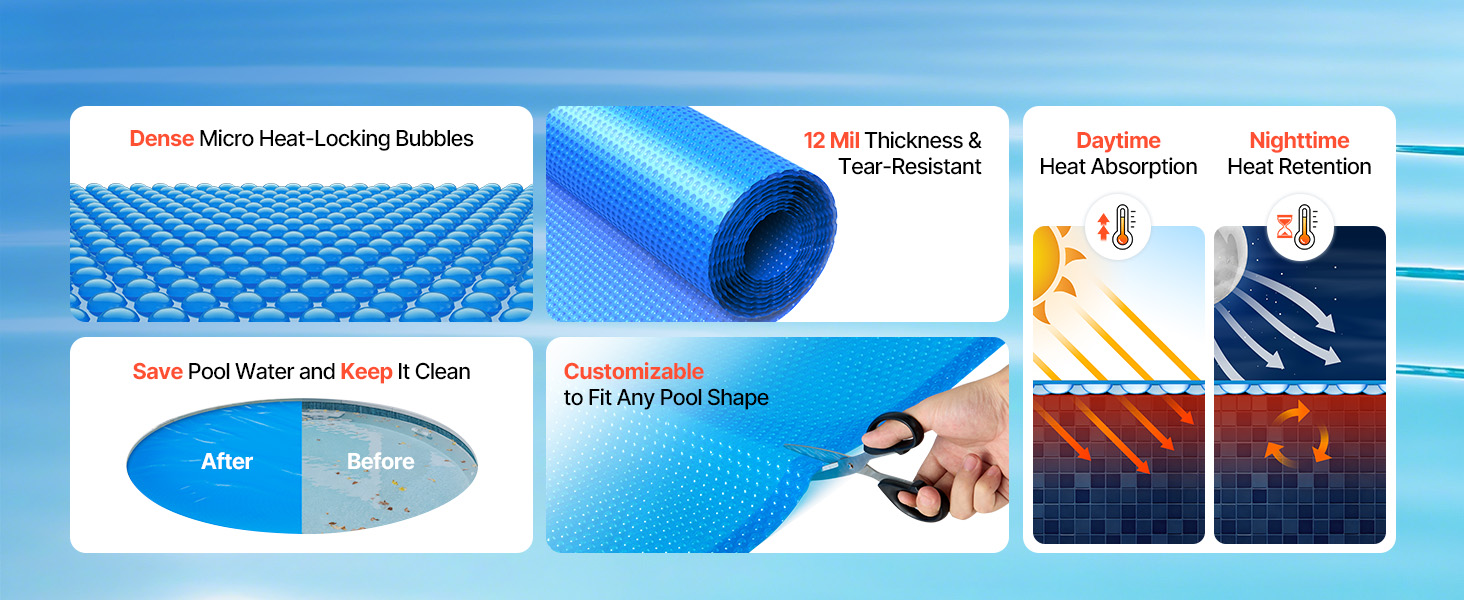 The solar pool cover features tightly packed micro-bubbles that effectively improve heat retention and reduce heat loss, ensuring your pool stays warm. This innovative design keeps the water at a comfortable temperature, so you can enjoy swimming without feeling cold.