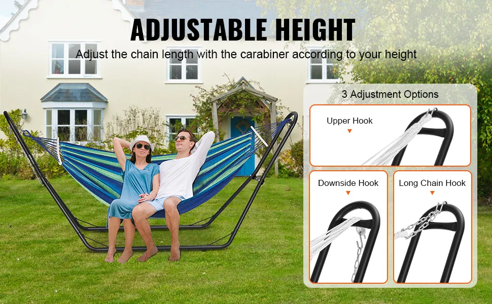 Easily adjust your hammock frame's height to meet the needs of different individuals with three adjustment options: Upper Hook, Downside Hook, and Long Chain Hook. This allows you to find the comfortable height, ensuring an optimal experience every time you use it.