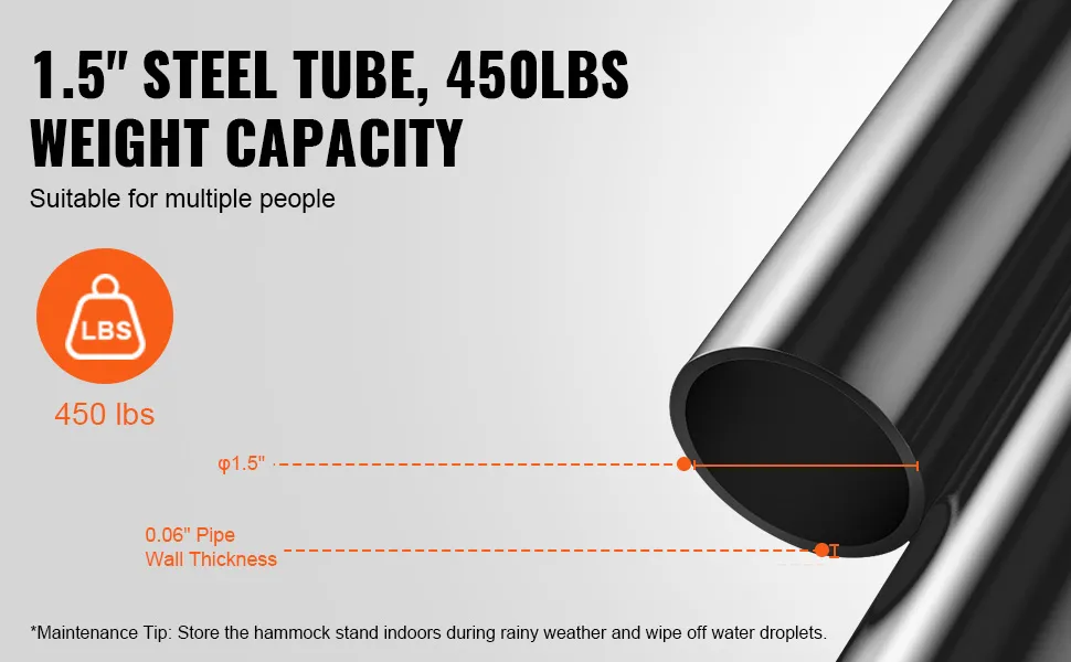 Изготовленная из утолщенных стальных трубок диаметром 1,5 дюйма (φ38 мм), эта подставка для гамака легко выдерживает нагрузку до 450 фунтов, обеспечивая вашу безопасность и комфорт. Конструкция из утолщенных стальных труб обеспечивает исключительную стабильность и долговечность даже при использовании несколькими людьми.