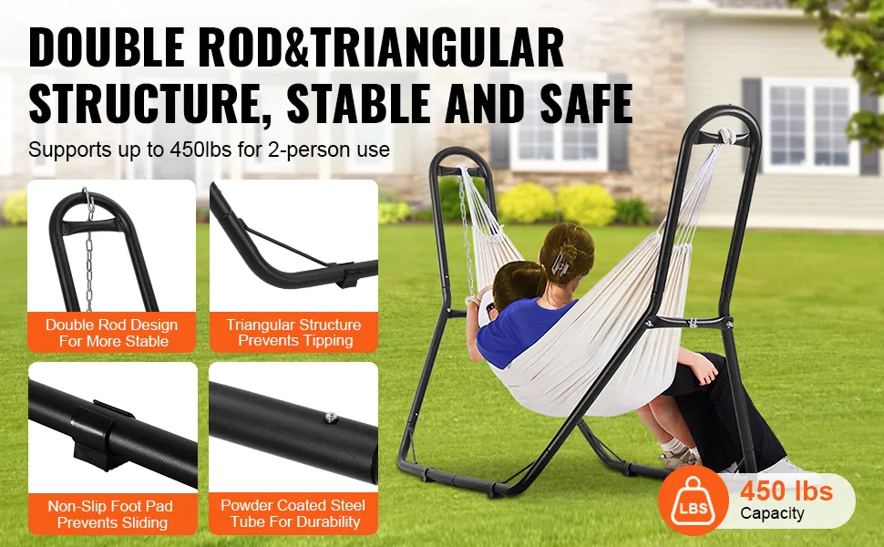 The unique dual rod design, combined with the stability of a triangular structure, ensures the portable hammock stand's sturdiness and comfort during use. Non-slip foot pads prevent sliding, while the powder-coated steel tube is robust and durable, ensuring comprehensive support and safety.