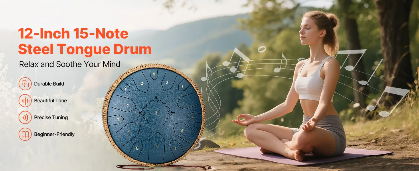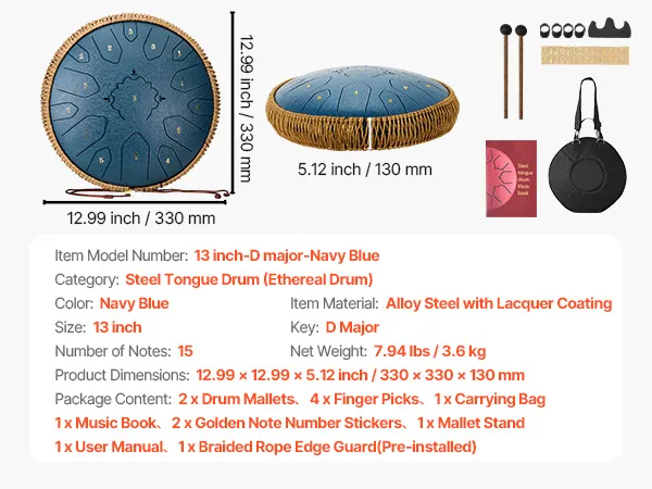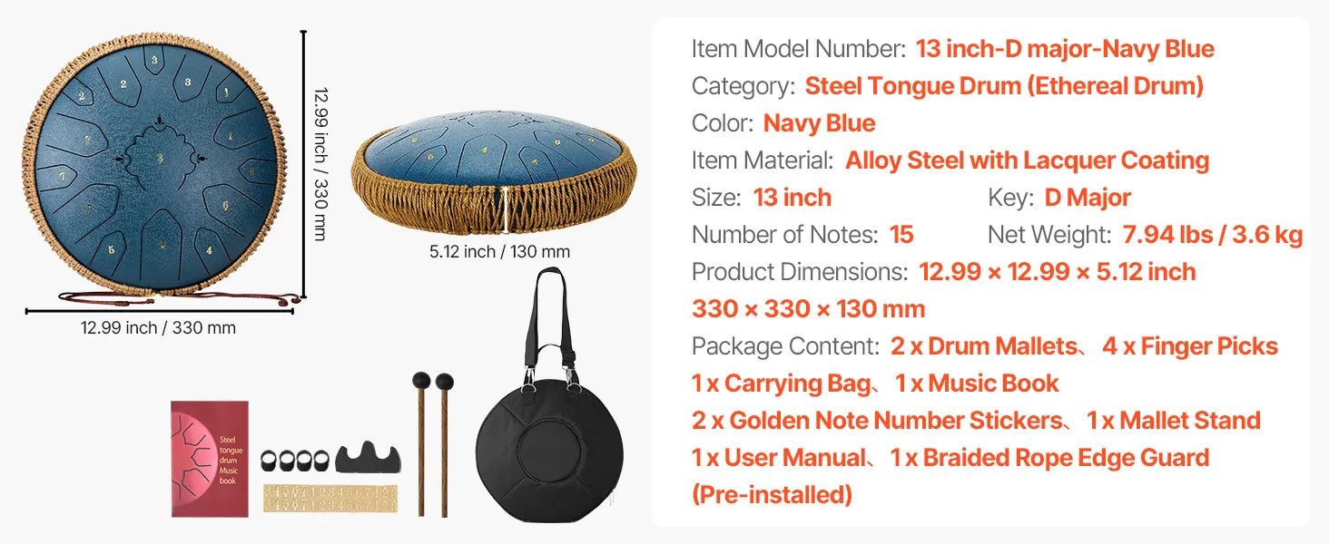 VEVOR Steel Tongue Drum, 33cm 15 Notes Rain Drum for Outside Garden, C Major Musical Drums with Music Book & Mallets, Percussion Instrument for Meditation Yoga Beginner Musical Education, Navy Blue