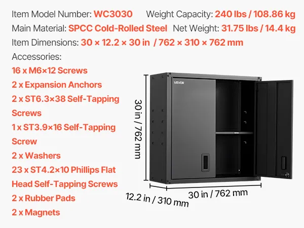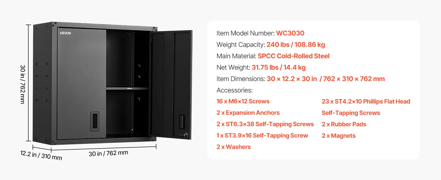 VEVOR Metal Wall Cabinet, 76.2W x 31D x 76.2H cm, Steel Floating Hanging Storage Cabinet with Locking Doors and Adjustable Shelf for Garage, Basement, Kitchen, Warehouse Assembly Required, Black