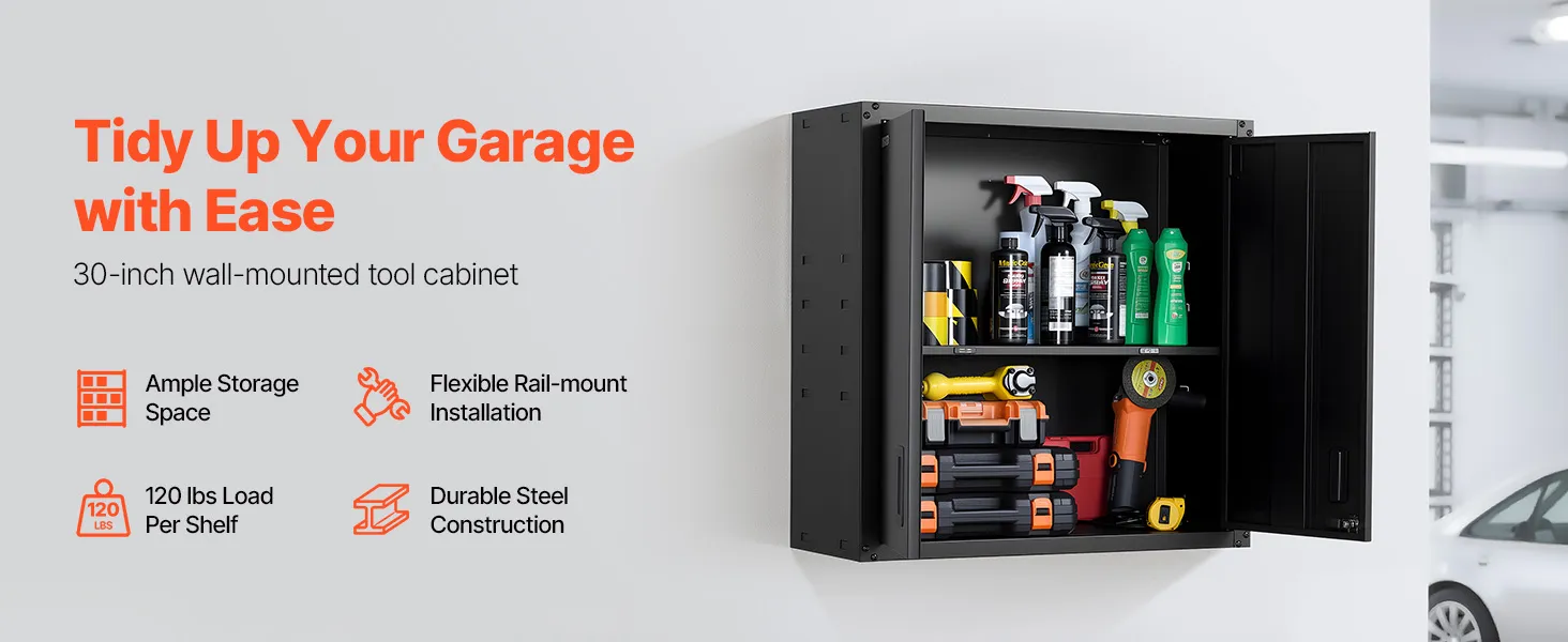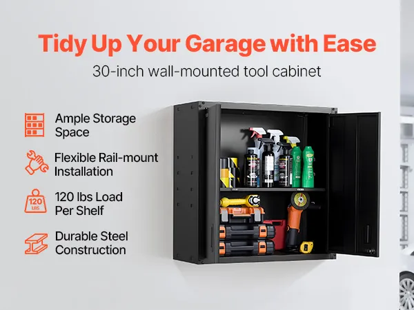 Store more with this sturdy steel wall cabinet! Each shelf holds up to 120 lbs, and the hanging rail makes setup quick. Great for keeping your garage neat and clutter-free.