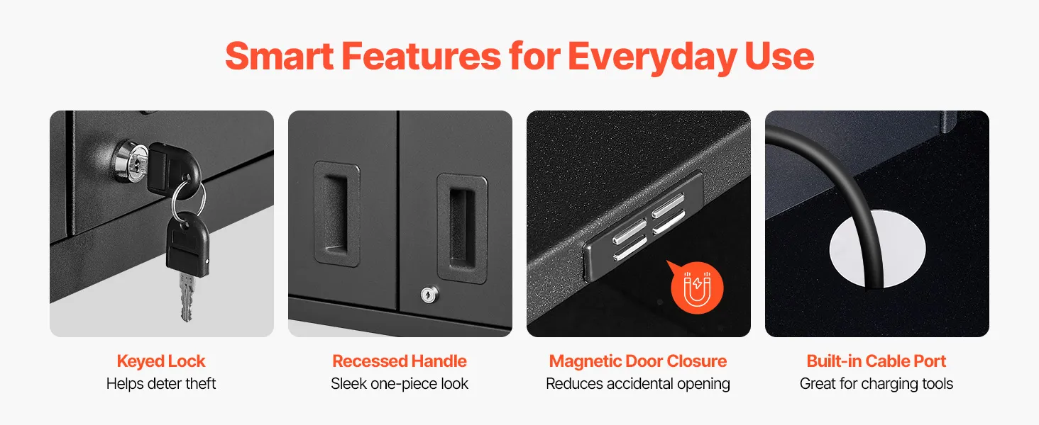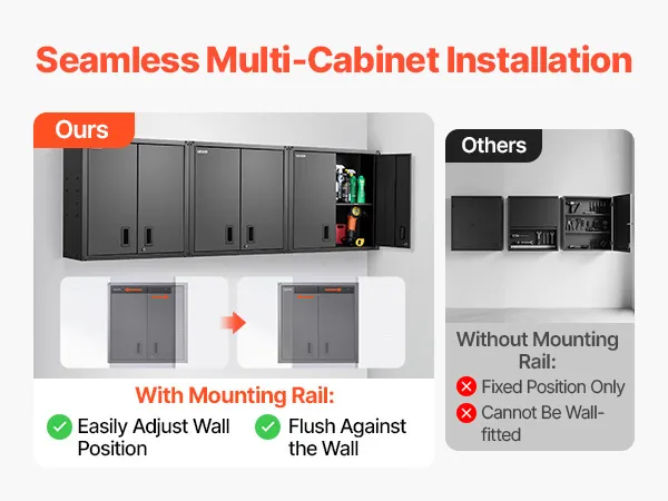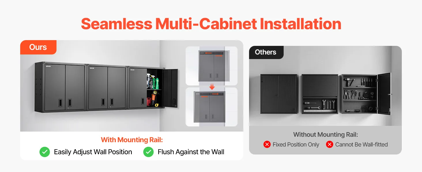 The smart hanging rail of the wall-mounted garage cabinet lets you mount it flush to concrete or wood walls. Get a seamless, polished look with rock-solid stability.