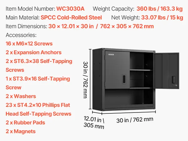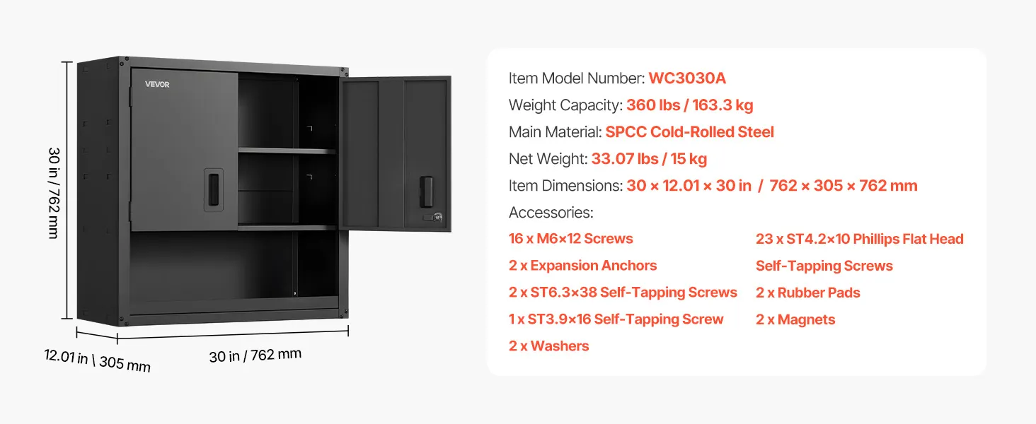 • Space-saving Storage: This 30 x 12.01 x 30 inch metal wall cabinet makes the most of wall space, holding up to 120 lbs per shelf. Three adjustable levels let you store tools and supplies of different heights with ease