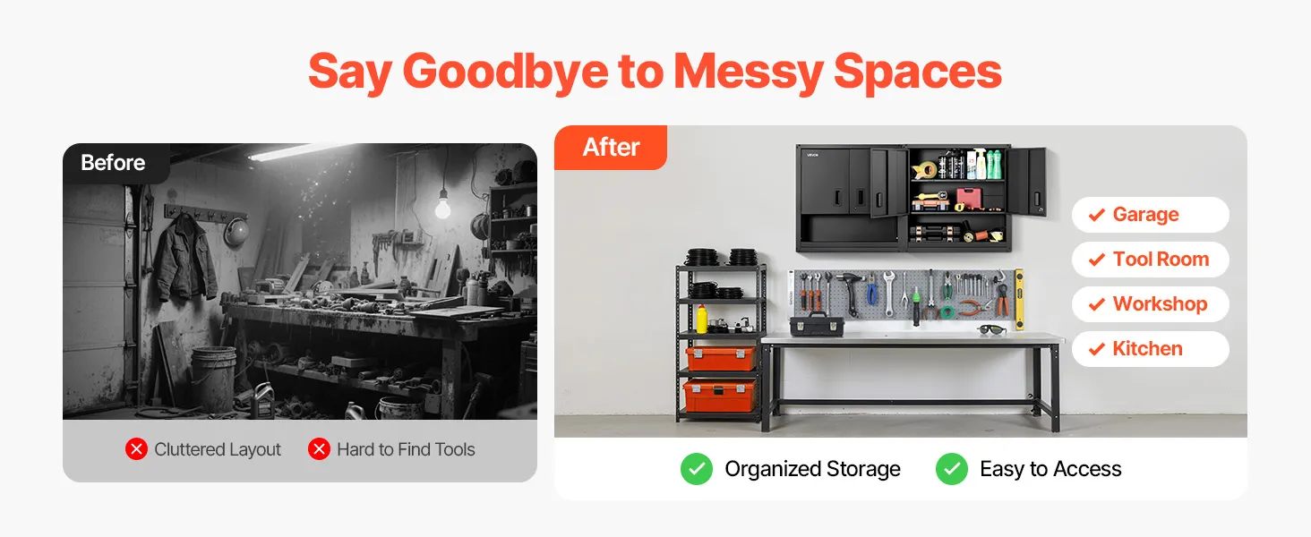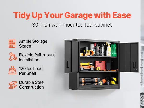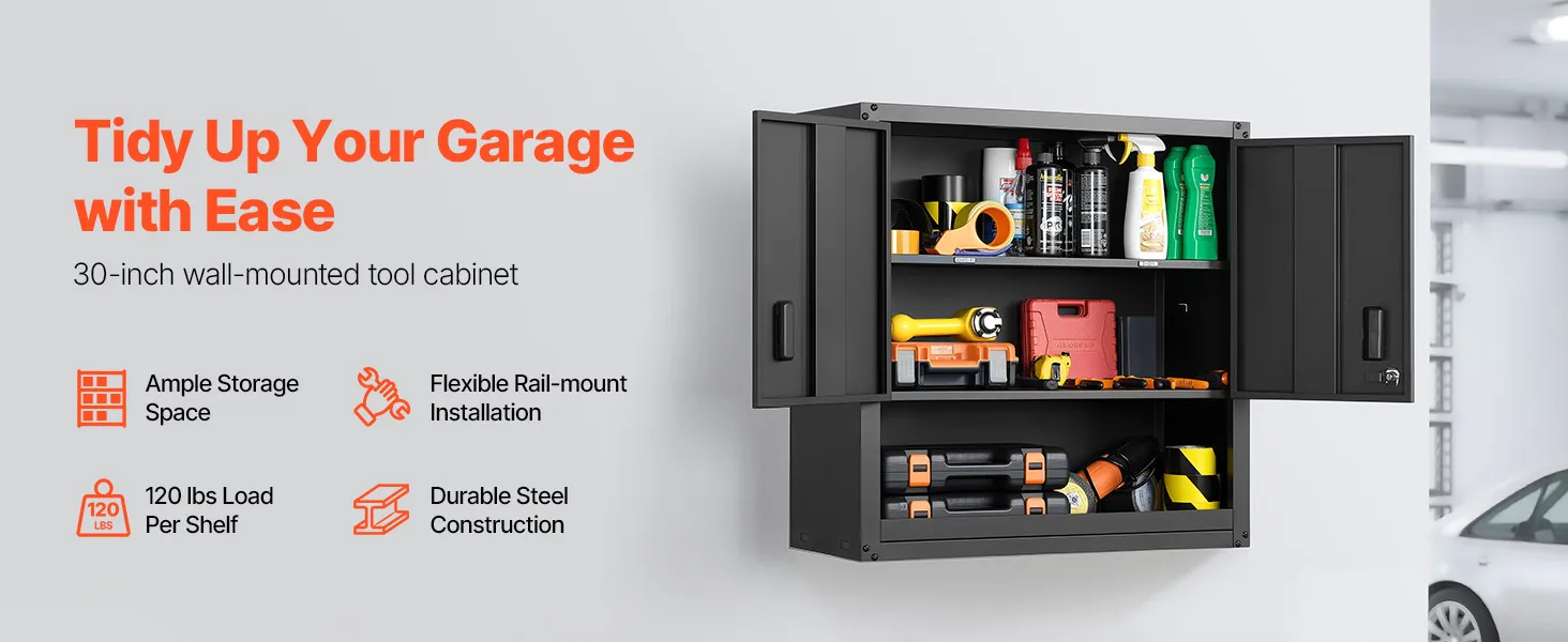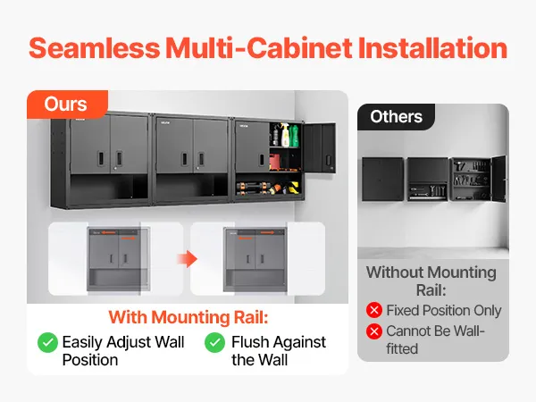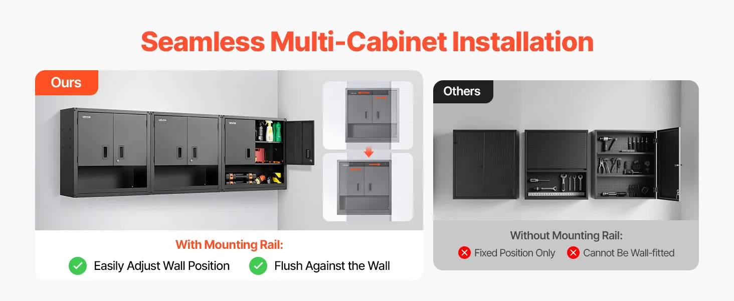 • Flexible Installation: The rail-mount design of the wall-mounted garage cabinet allows quick, secure, and flush wall installation. Ideal for garages, kitchens, or workshops—adjust placement to fit your layout